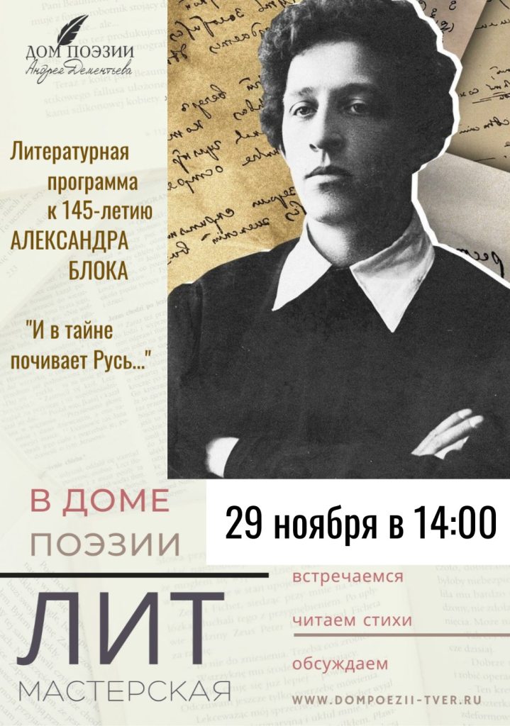 Дом поэзии Андрея Дементьева в Твери приглашает жителей и гостей Твери на литературную программу «И в тайне почивает Русь…», посвященную 145-летию со дня рождения Александра Блока. Мероприятие состоится 29 ноября 2025 года в 14:00.