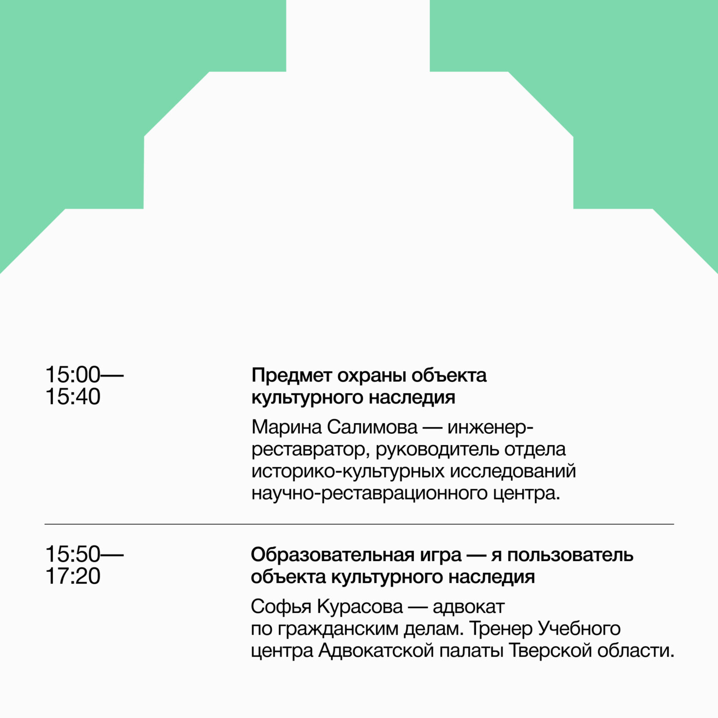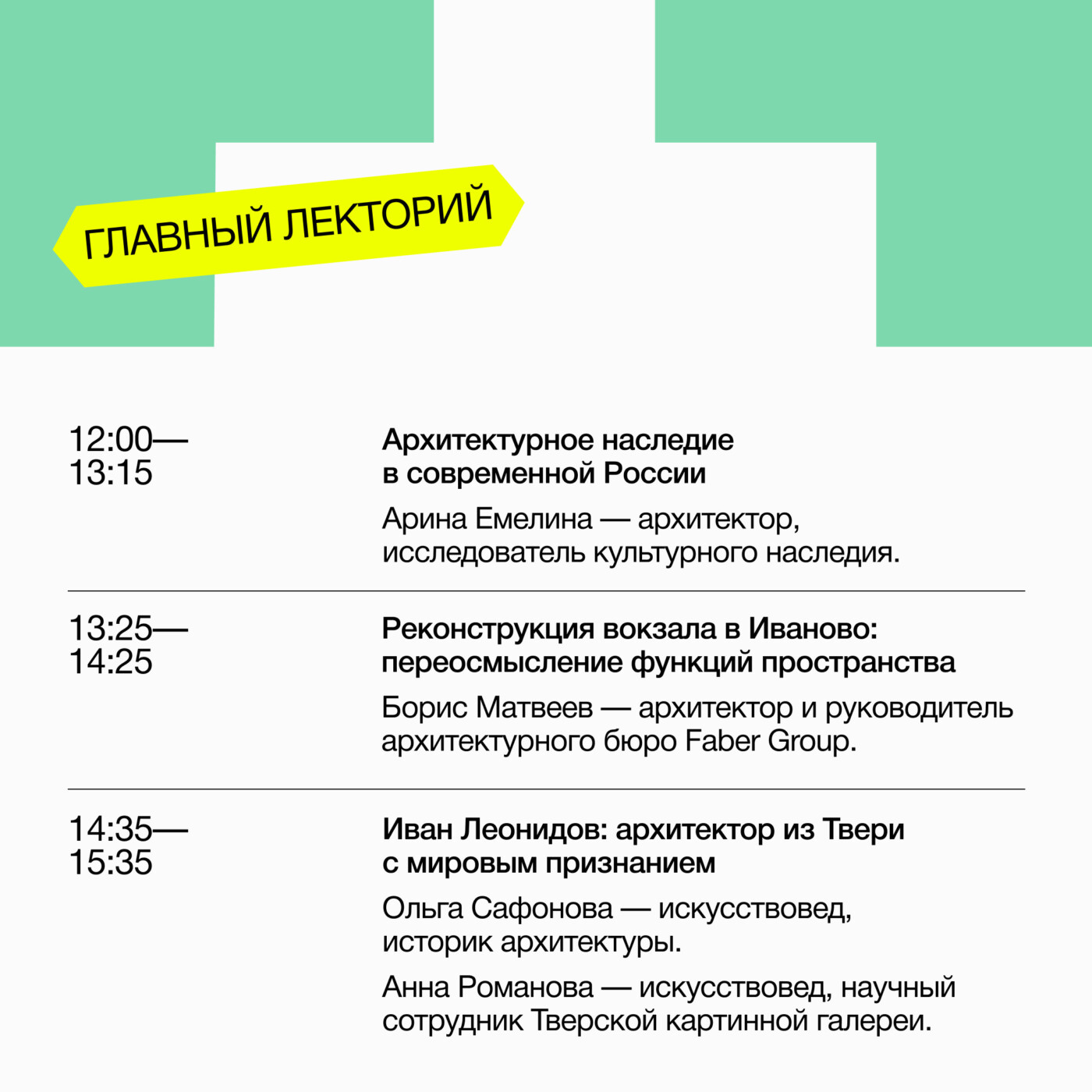 На лекциях выступят спикеры из Твери, Москвы, Сысерти Свердловской области, Кимр и Осташкова. Они расскажут, как превратить здание вокзала в культурное пространство, что представляет собой архитектурное наследие в современной России, как волонтеры превратили промышленную зону в культурно-выставочный проект. Какого тверского архитектора ценят во всём мире, но мало знают на родине? Зачем устраивать чаепития в руинах и можно ли силами горожан беречь уникальный облик города? Ответ на эти и многие другие вопросы посетители фестиваля узнают на лекциях.