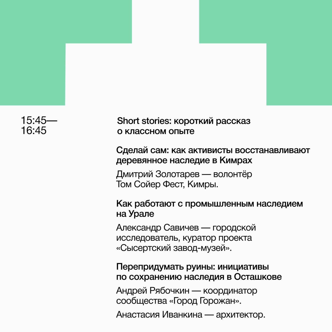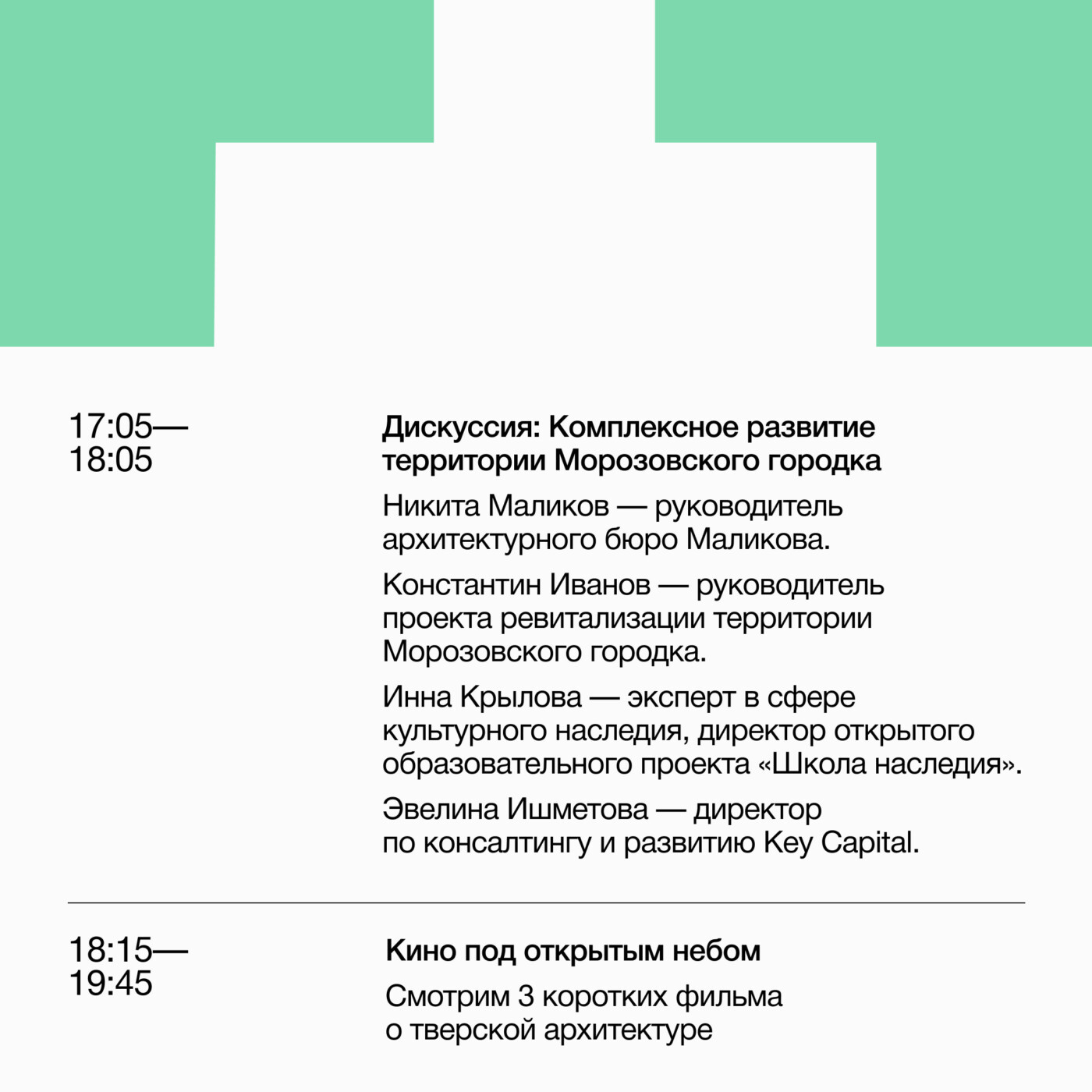 В рамках фестиваля также состоится дискуссия с архитекторами и предпринимателями о судьбе территории Морозовского городка.