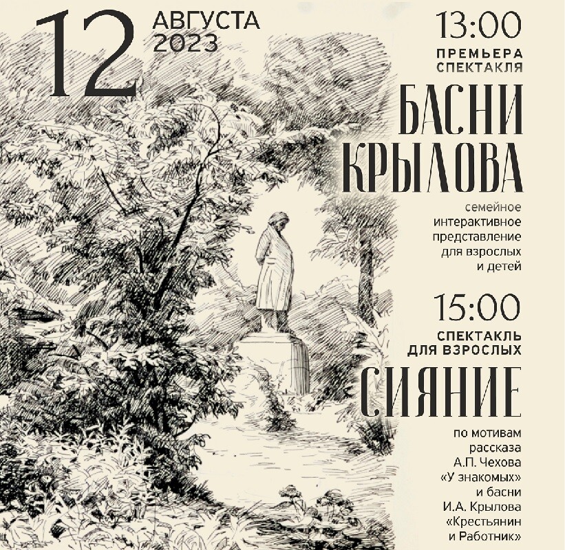 В 13 часов на даче «Чайка» ждут юных зрителей и их родителей на премьеру спектакля «Басни Крылова» – семейное интерактивное представление для взрослых и детей.