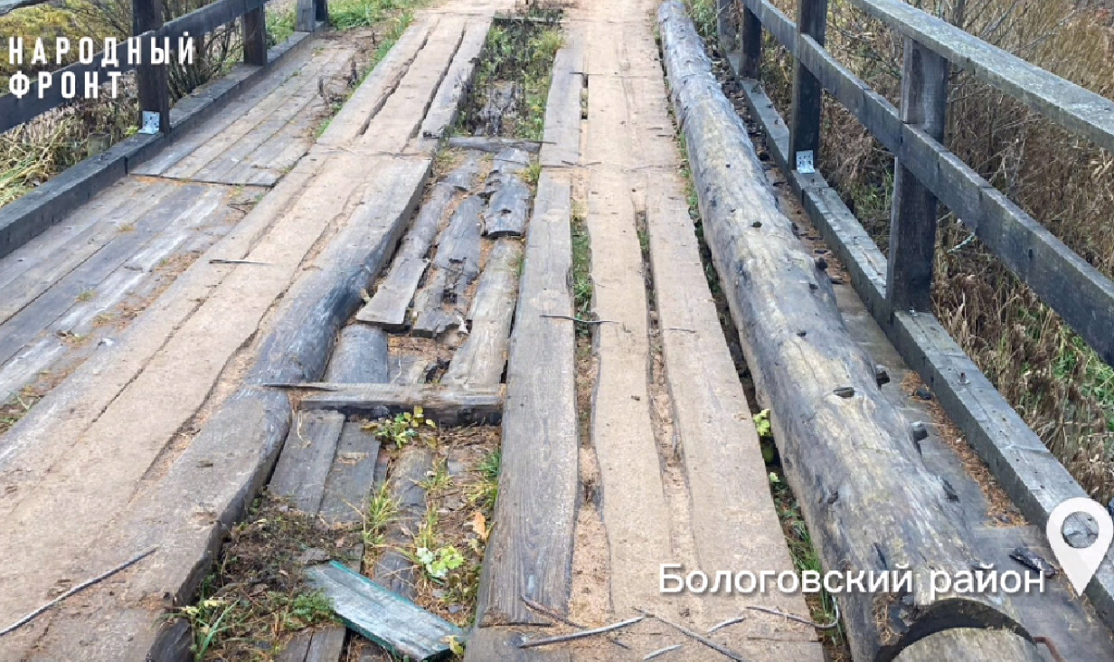 Жители деревни Денисова Горка Бологовского муниципального округа Тверской области пожаловались в Народный фронт на деревянный мост, связывающий две стороны деревни, который стал для них трудно преодолимой преградой.