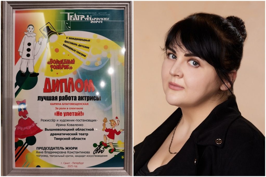 В рамках фестиваля вышневолоцкие артисты представили на сцене «Театра у Нарвских ворот» спектакль режиссера Ирины Коваленко «Не улетай!» (0+). Это поэтичная сказка о бескорыстной преданности и душевной красоте двух друзей – Пугала и Аистенка. Две роли – Кота и Снеговика – в постановке исполнила Карина Благовещенская. Эти работы принесли ей победу в номинации «Лучшая работа актрисы». Жюри фестиваля отметило высокий профессионализм актрисы, яркие образы и характер ее героев, сообщила пресс-служба правительства Тверской области.