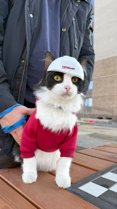 История кота началась ещё летом — на стройке девелопера “Новый город” обнаружили чёрно-белого красавца. Бездомный пушистый, видимо, решил, что надо брать судьбу в свои лапы и строить себе дом самостоятельно.