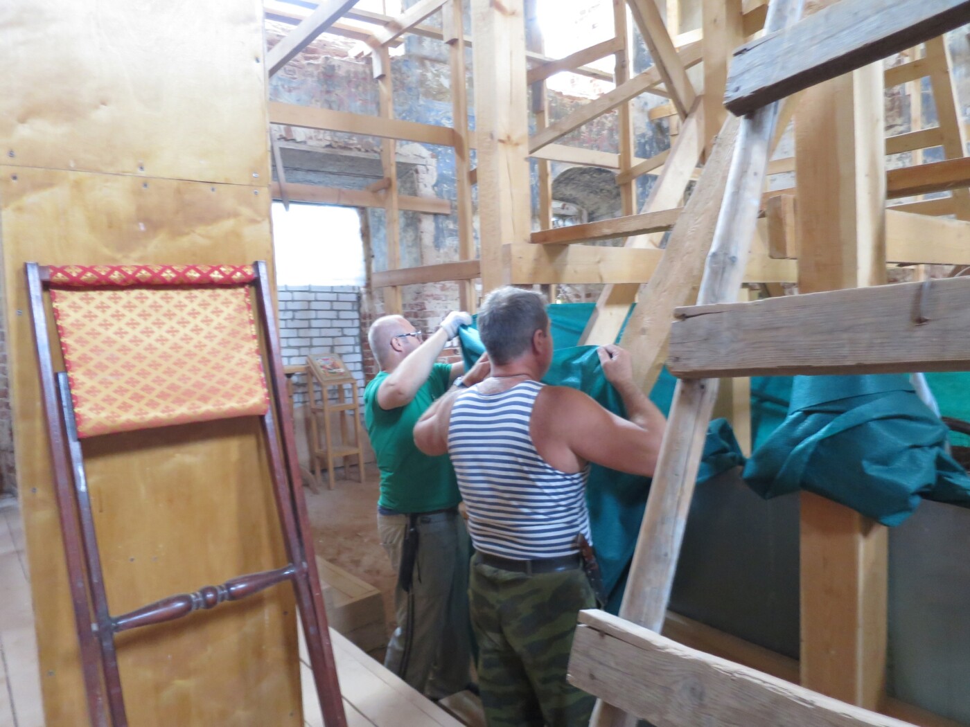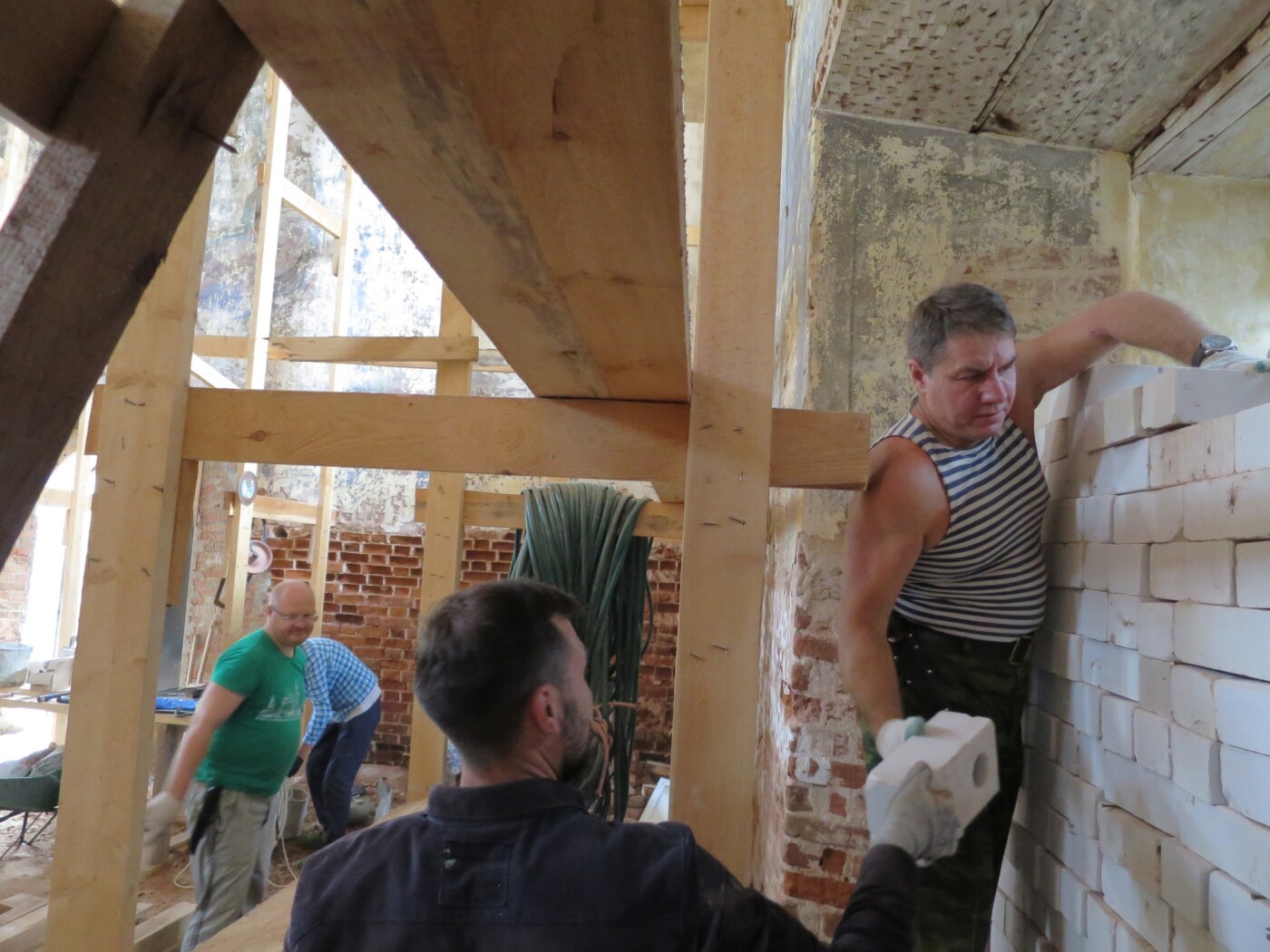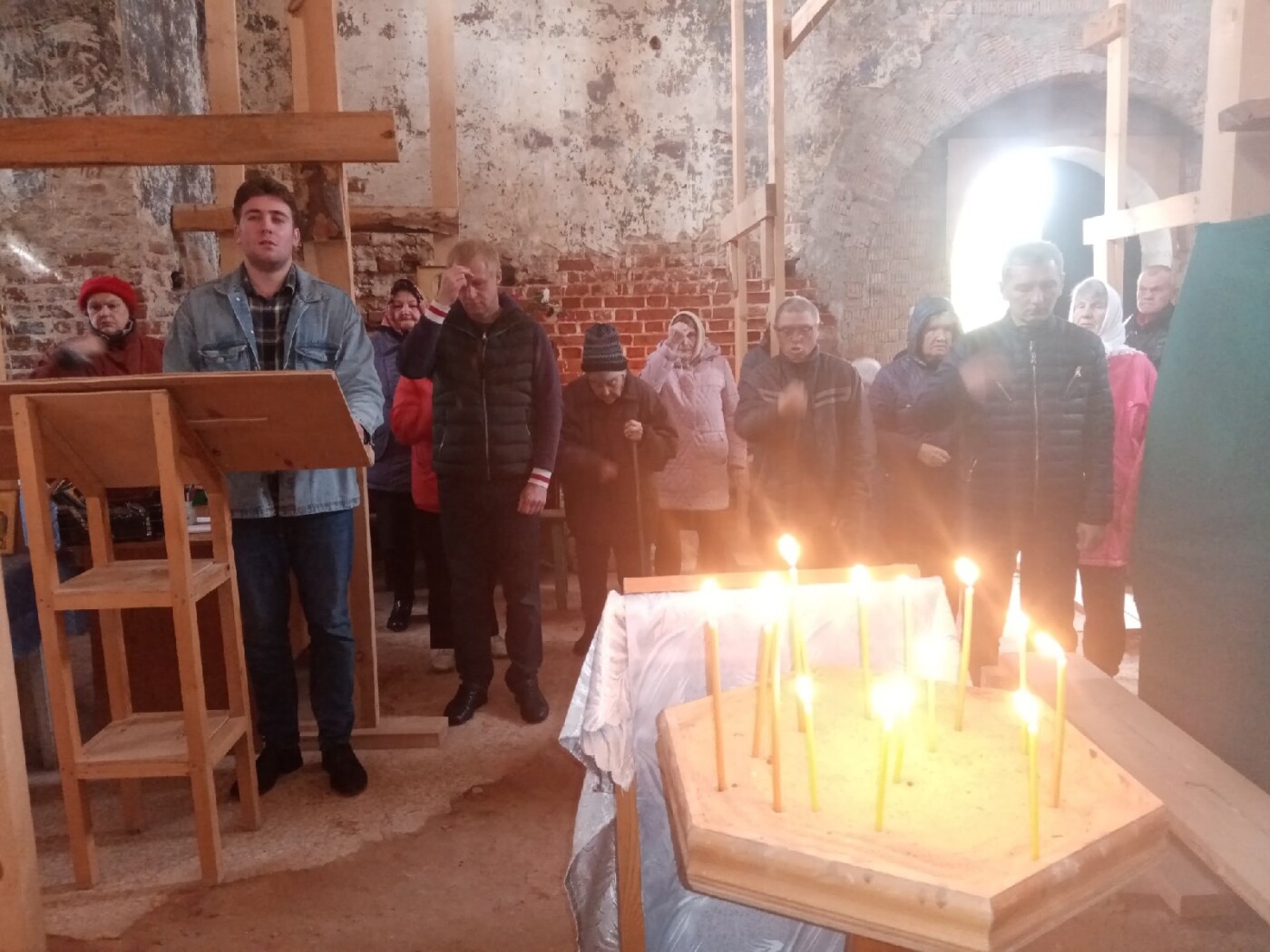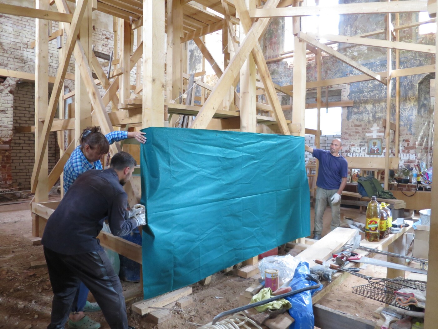 — Раз съездили, второй, третий. И вот один из нас не выдержал и сказал: «Если мы не предпримем никаких попыток по восстановлению, то ещё одной грудой битого кирпича станет больше». Мы были горячи и наивны — вспоминает председатель клуба «Сеятель» Алексей Андреев. – Сначала мы собрали денег на временную крышу, своими руками сколотили алтарь из фанеры и досок, убрали огромный слой грунта, перемешанный с мусором. Поставили ворота. В 2013 году нам удалось накопить средства на вычинку кирпича на обрушенных углах четверика, а в 2015 году на вычинку крыши и устройство постоянной кровли. Но сами работы растянулись на несколько лет.