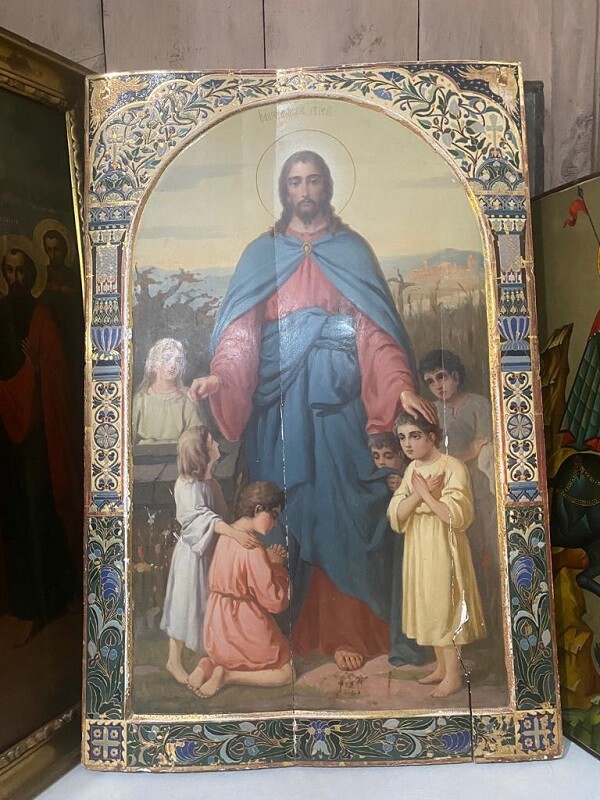 «Эту икону я обнаружил недалеко от того места, где в Конакове стояла церковь святого Александра Невского, – рассказал Николай Черкашин. – Церковь в известные годы разрушили, а иконы разошлись по окрестным домам. В 1973 году я приехал в гости к своей тетушке – Клавдии Петровне Чудиной, что жила в маленьком домике на улице Свободы. Там, в соседском сарае я увидел эту икону, приспособленную в качестве загородки из хлева в огород. Это и был образ «Христос и дети». Я увез его в Москву, привел в некоторый порядок. Икона почти полвека простояла в комнате мамы. Мама не раз повторяла, что сколько детей изображены рядом со Спасителем, столько правнуков послал ей Господь. И, наверное, не без основания, считала икону чудотворной.