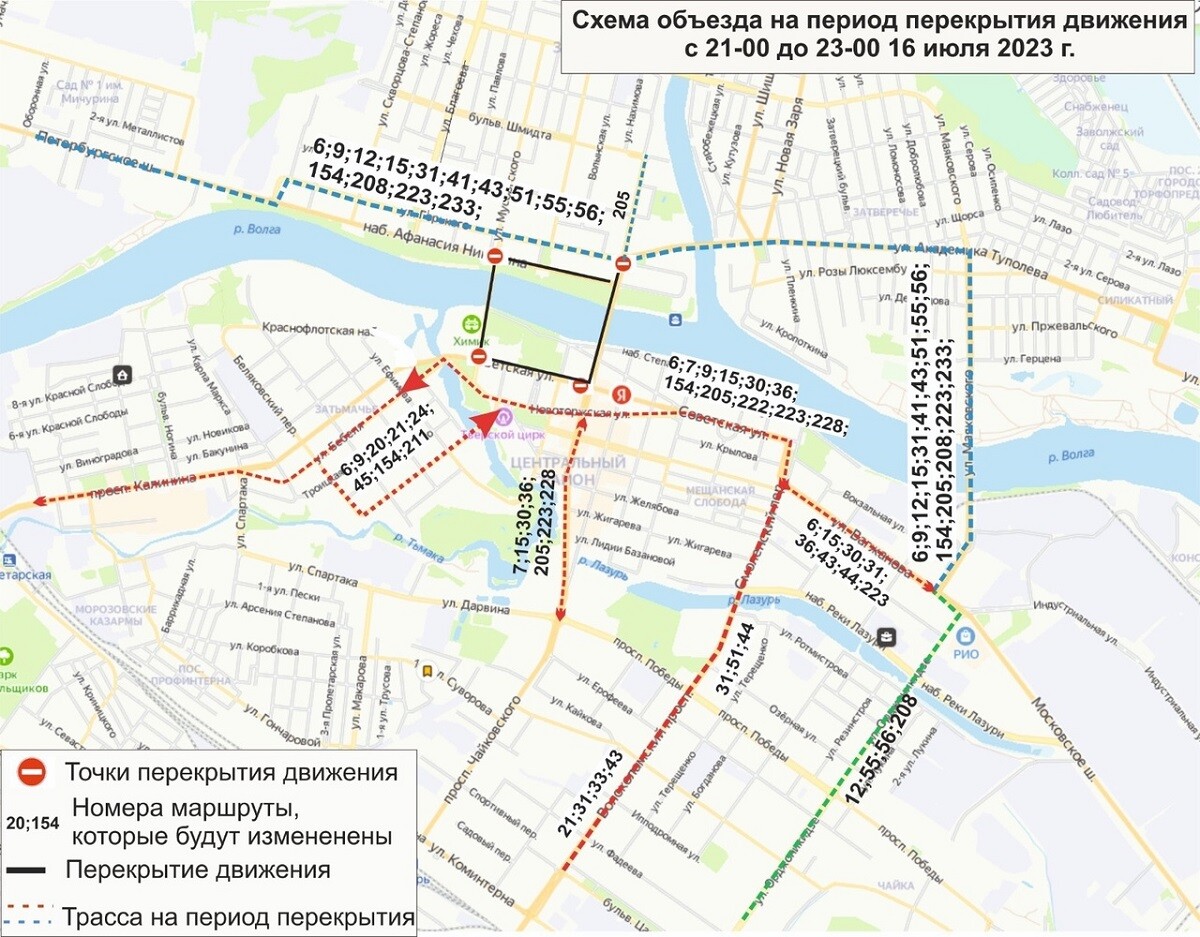 - с 21:00 до 23:00 – №6, №7, №9, №12, №15, №20, №21, №24, №30, №31, №33, №36, №41, №43, №45, №51, №55, №56, №154, №205, № 208, №211, №222, №223, №228, №233. Из-за закрытия Старого и Нового волжских мостов они поедут через Восточный мост.