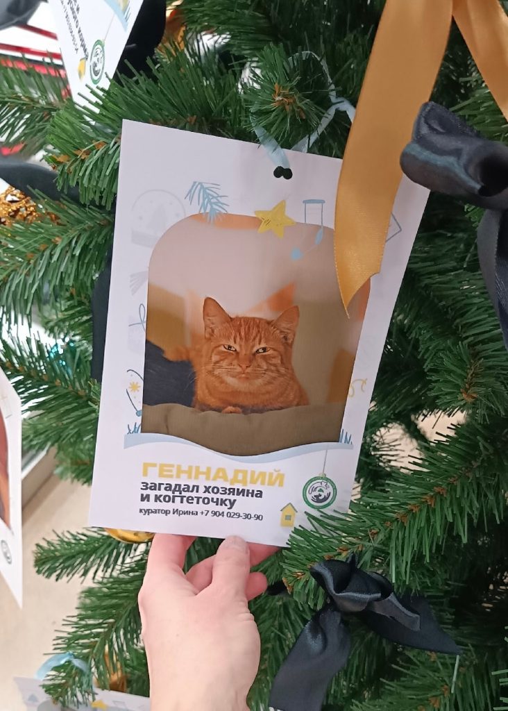 Гостей встречает метровый кот по кличке Суворов, а вместо игрушек на ёлке — открытки с пожеланиями бездомных животных.