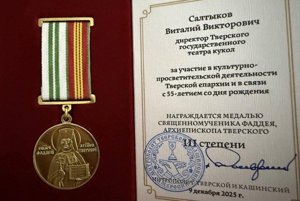 Художественный руководитель Тверского театра кукол Виталий Салтыков удостоен награды Тверской епархии – медали священномученика Фаддея, архиепископа Тверского, III степени.