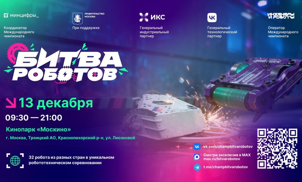 13 декабря в Москве пройдет финал Международного чемпионата по битве роботов сезона 2025 года. На территории кинопарка «Москино» соберутся сильнейшие команды из разных уголков мира, одержавшие победу на предыдущих этапах. В их число войдет команда из Тверской области «Несгибаемые».