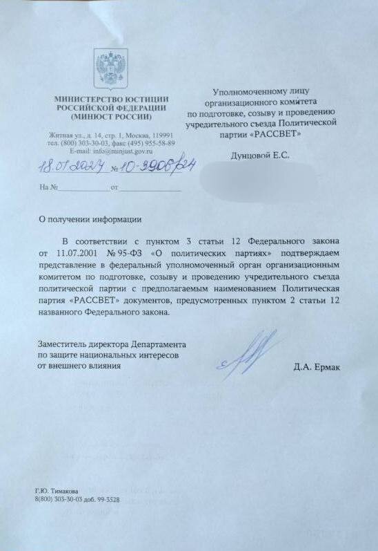 «Мы уведомили Минюст о своем намерении создать политическую партию «Рассвет» и подали все необходимые документы. Теперь мы готовимся к проведению учредительного съезда нашей партии», — написала Екатерина Дунцова, приложив ответ от Минюста.