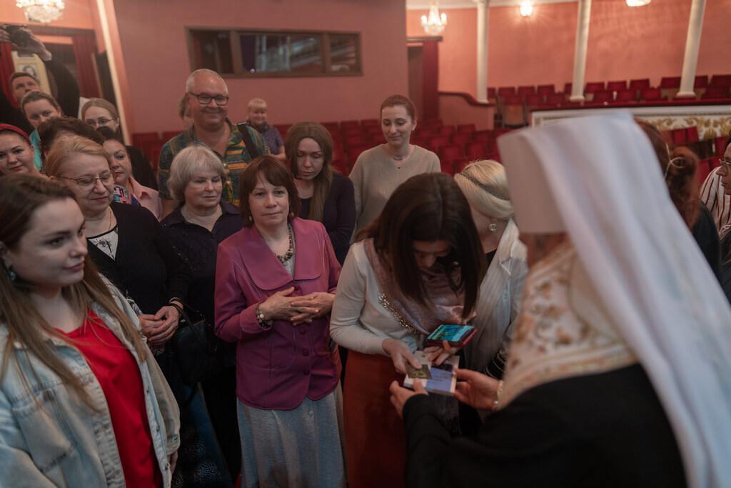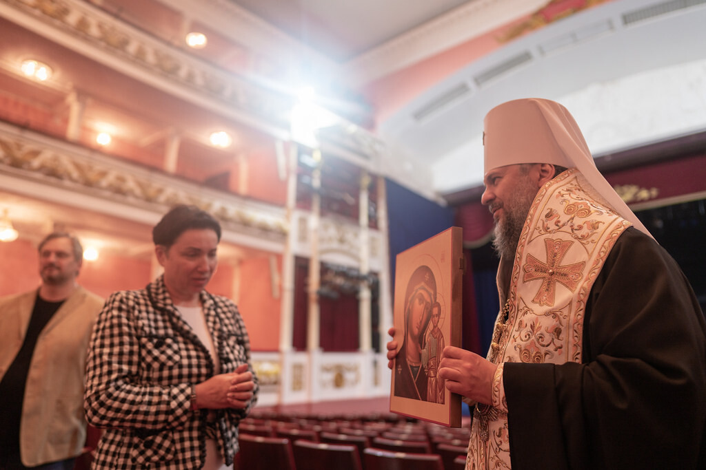 Митрополит передал директору театра Казанскую икону Божией Матери, а театральным служащим подарил книгу «Добро пожаловать в Церковь», а также иконки Феодоровского образа Божией Матери с благословением патриарха Кирилла.