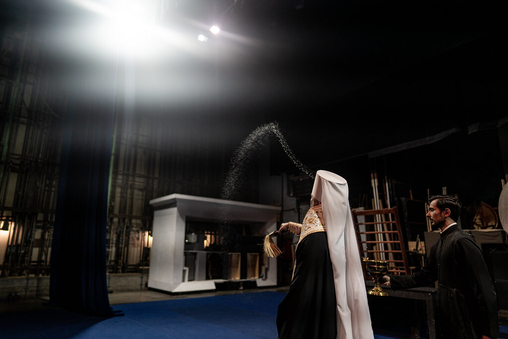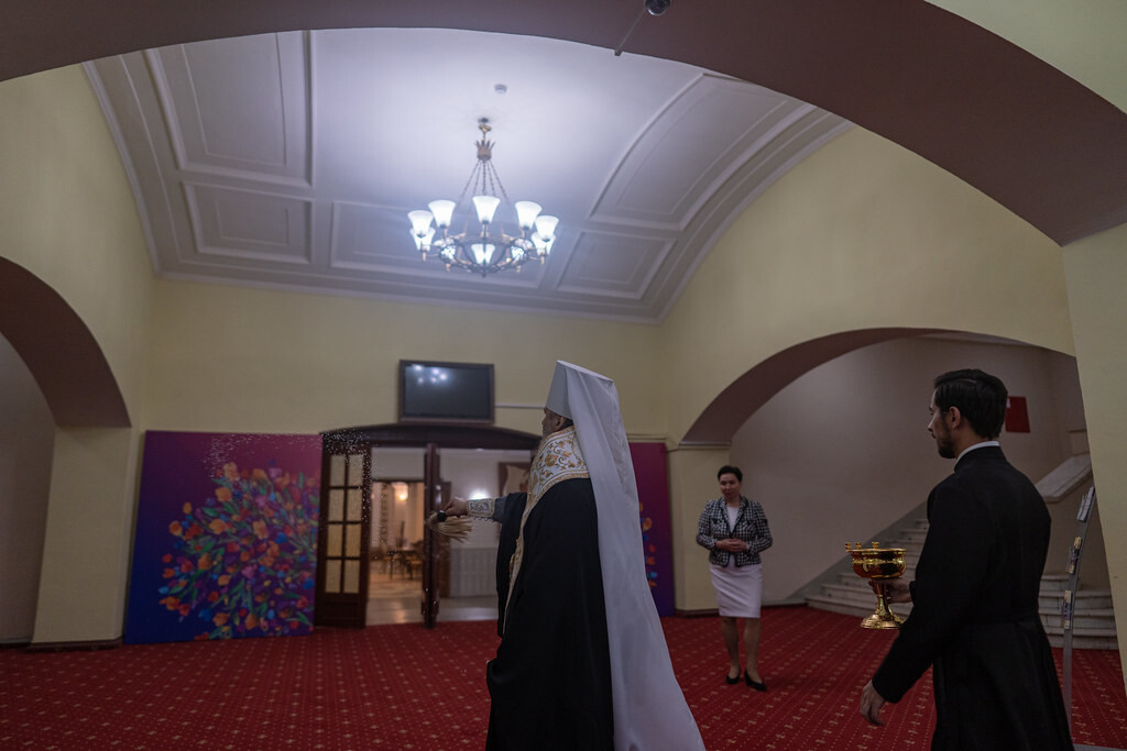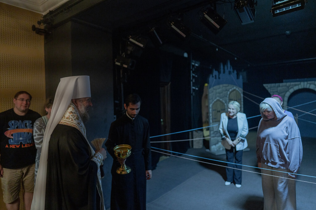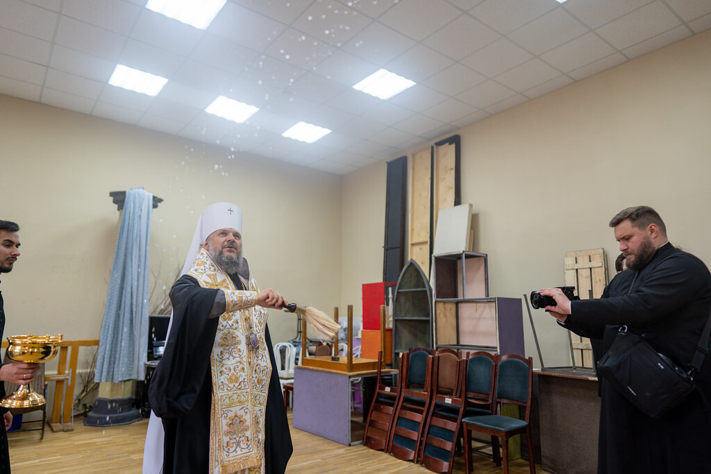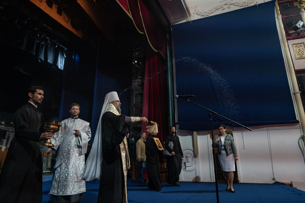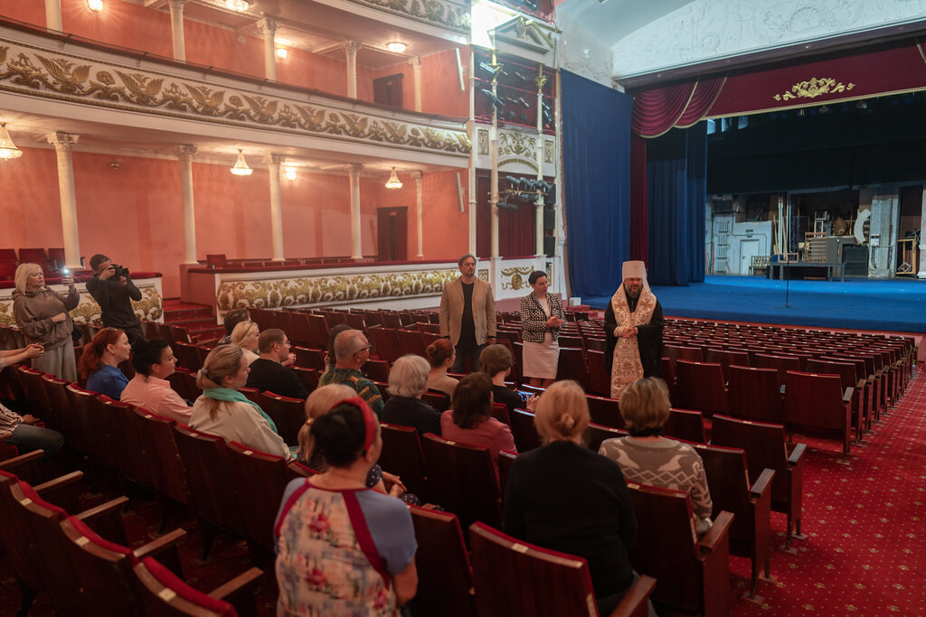 Перед театром митрополита Амвросия встретили директор драмтеатра Елена Постнова и главный режиссер театра Александр Павлишин. По их просьбе владыка совершил чин освящения здания и окропил залы и помещения театра.