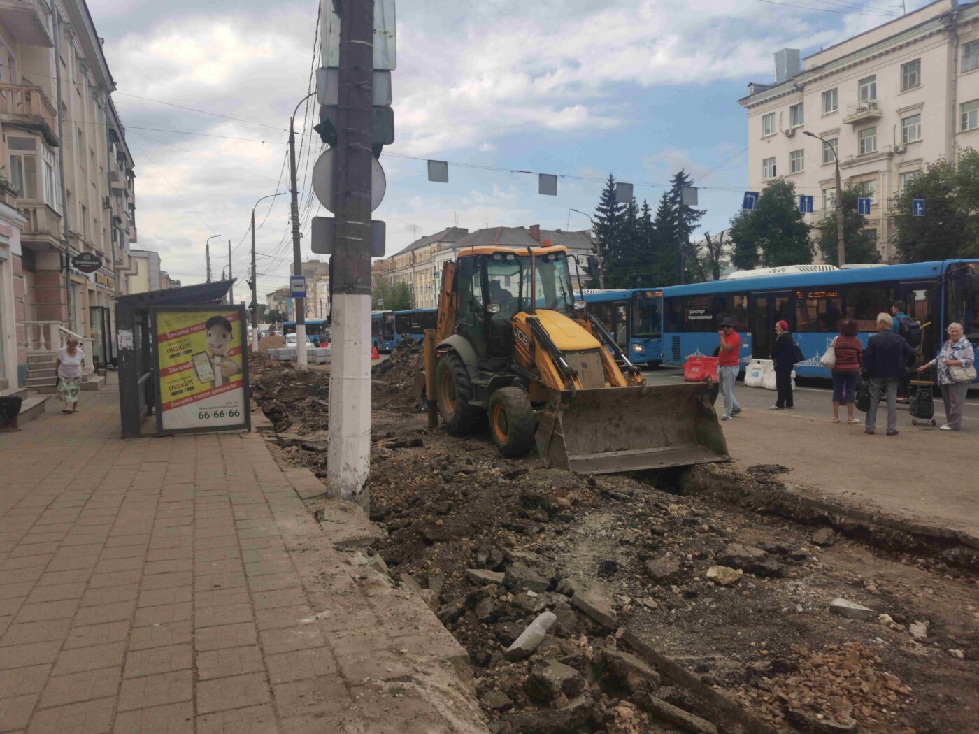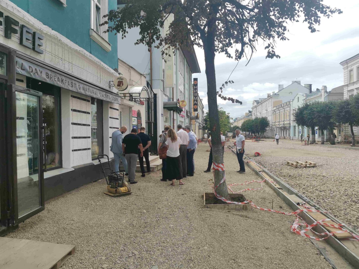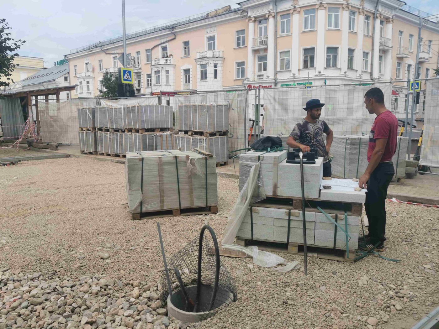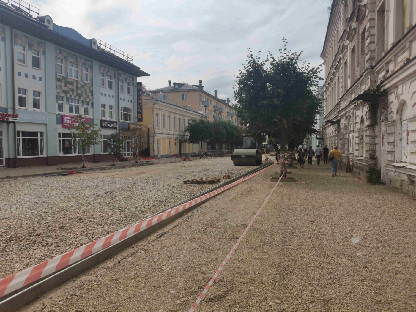 В начале августа Трехсвятская превратилась в полосу препятствий. Людям пришлось ходить по бетонным плитам, из которых торчали острые штыри. Сейчас на их месте установили водостоки, а всю улицы засыпали щебенкой. Ходить по ней стало безопасно. В скором времени рабочие должны начать укладку брусчатки.