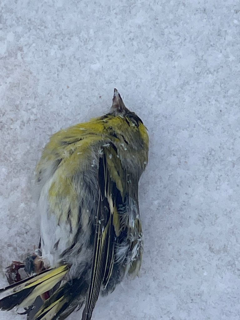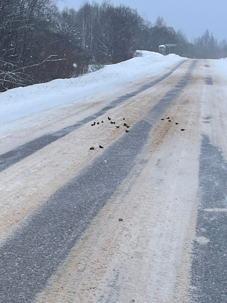 Такая картина только в Калининском и Конаковском округах. Скорей всего это произошло потому, что в песко-соляной смеси, которой посыпают дороги, есть следы зернышек. Птицы самоубиваются и даже от сигнала не всегда улетают.