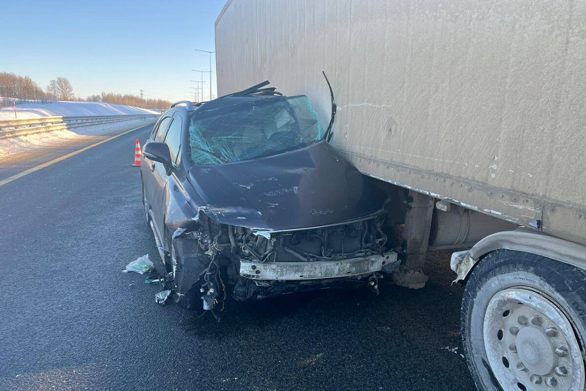 По предварительной информации, сначала иномарка врезалась в металлическое ограждение дороги, а потом столкнулась с движущимся в попутном направлении грузовиком Volvo. От удара легковой автомобиль буквально влетел под прицеп фуры.