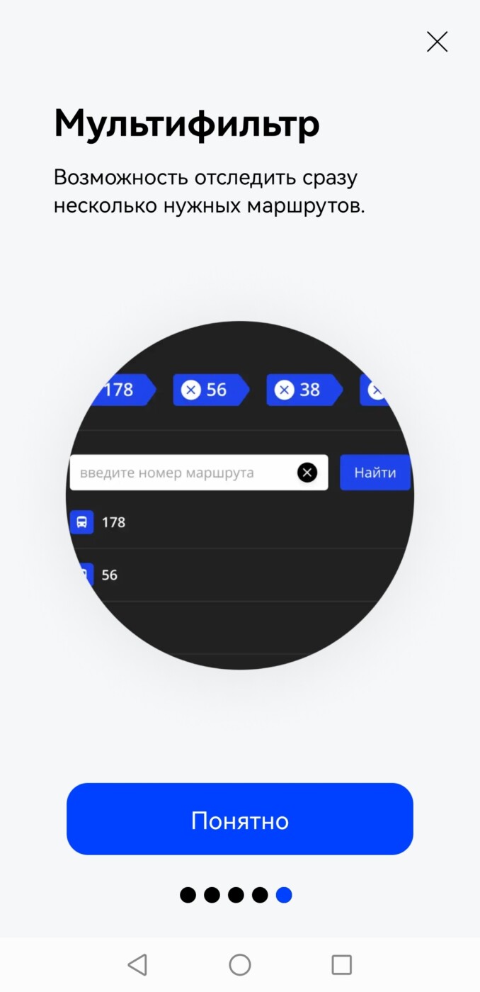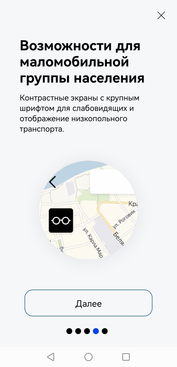 Возможность для маломобильной группы населения. Контрастные экраны с крупным шрифтом для слабовидящих и отображение на карте низкопольного транспорта.