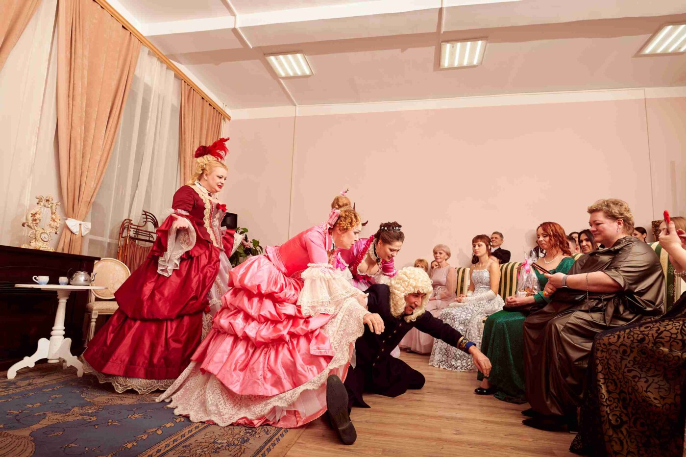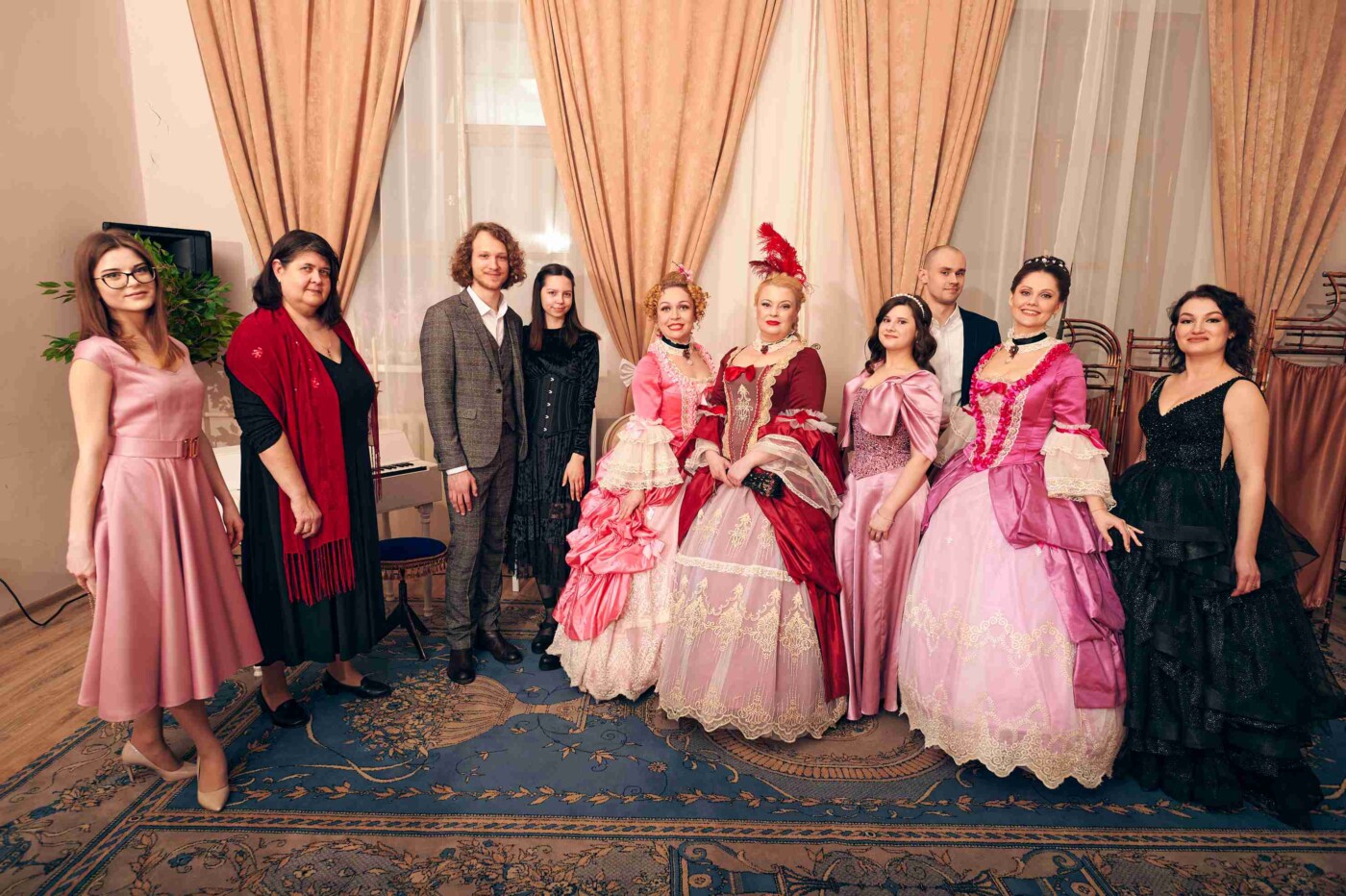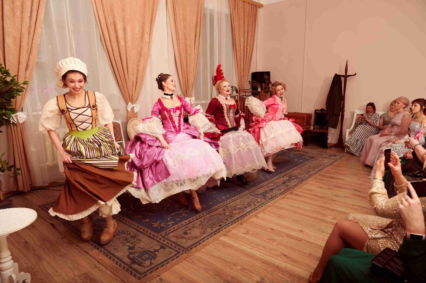 После гости разделились на четыре группы в соответствии с названиями бальных танцев – полонез, мазурка, кадриль и вальс – и отправились в уникальное путешествие по балам из постановок театра драмы.