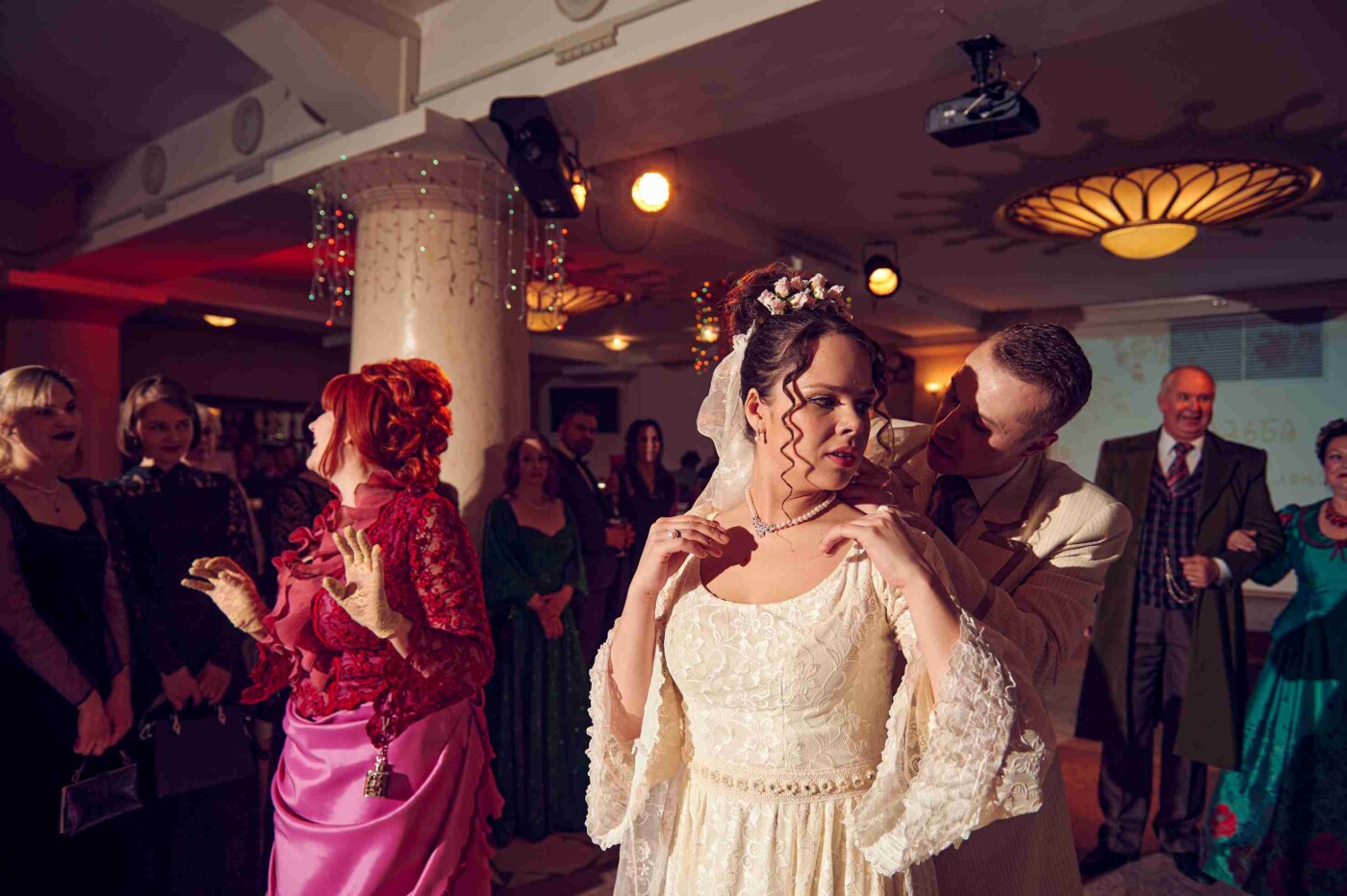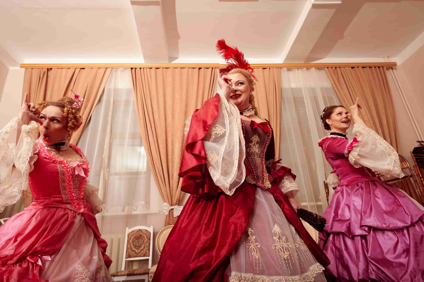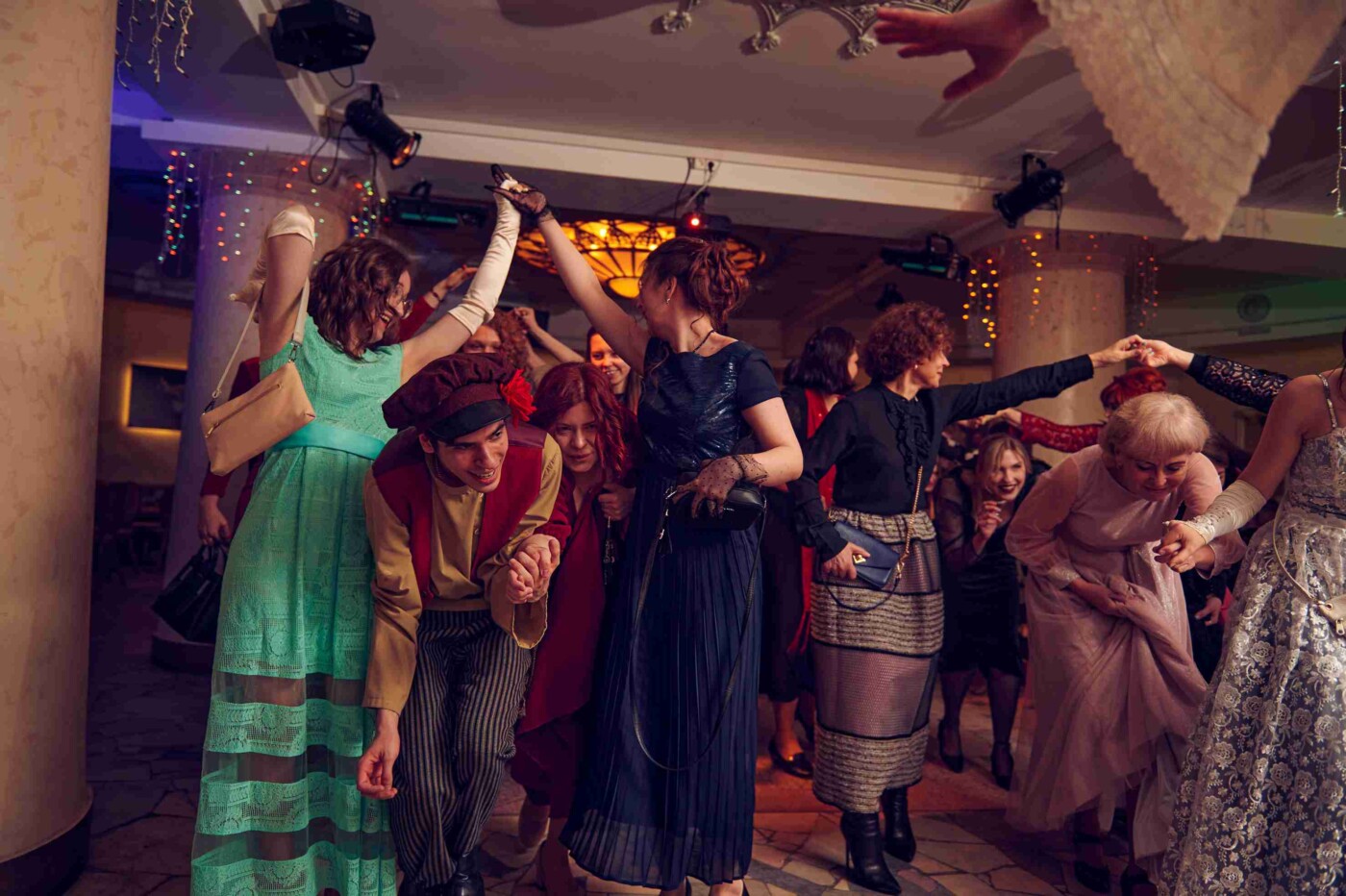 После гости разделились на четыре группы в соответствии с названиями бальных танцев – полонез, мазурка, кадриль и вальс – и отправились в уникальное путешествие по балам из постановок театра драмы.