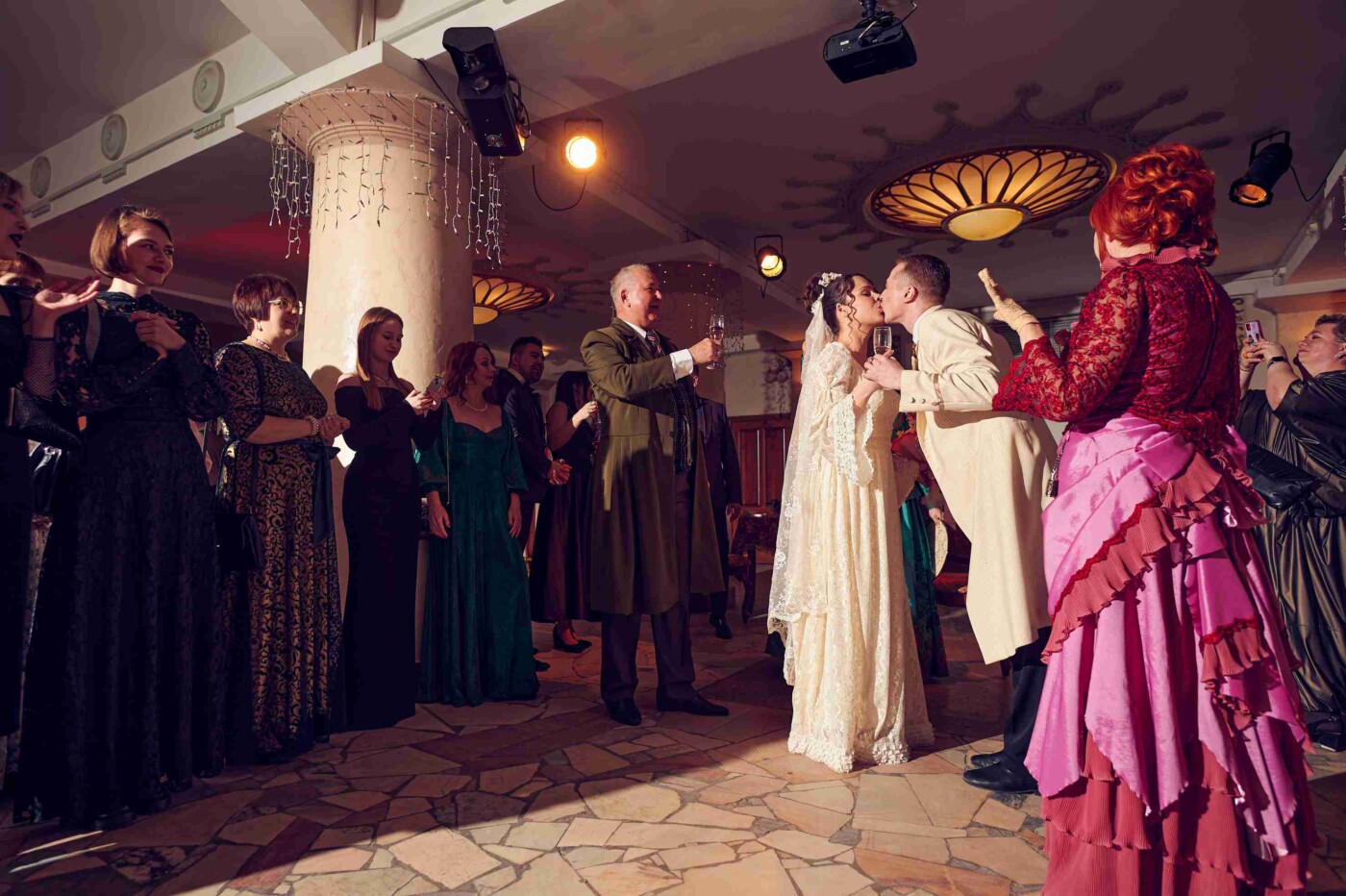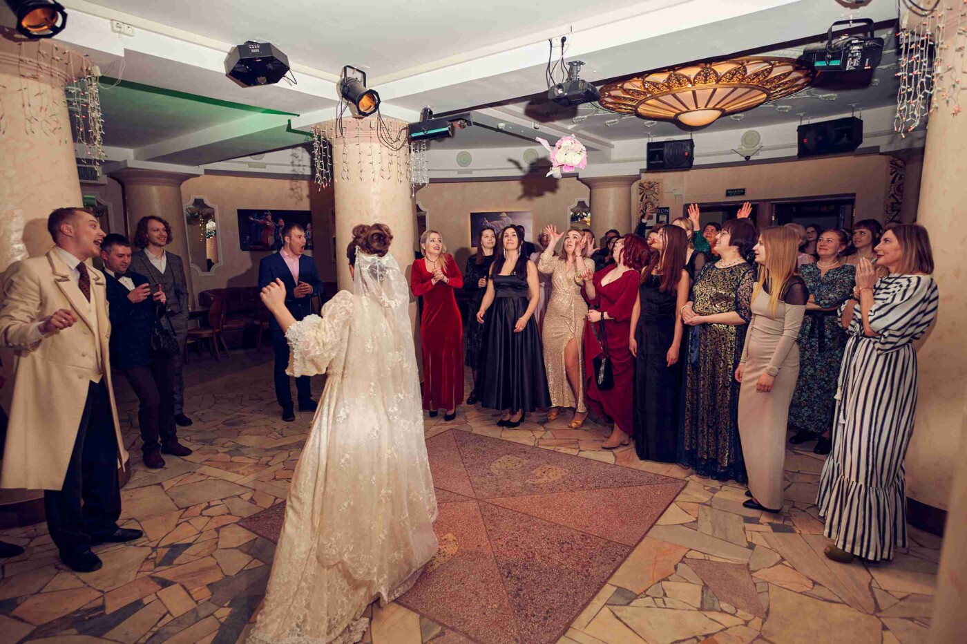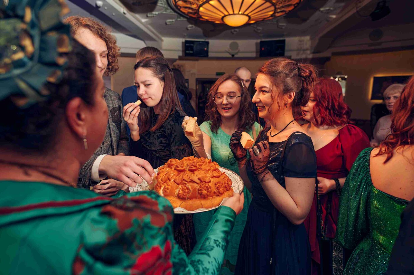 Домом Белугиных стало театральное кафе. Здесь гостям в первую очередь предложили баранки с предсказаниями (мне, например, была предсказана поездка на море). А потом были пожелания счастья молодым, веселые народные танцы и дегустация свадебного каравая. В завершение свадебного бала одна из гостей поймала букет невесты.