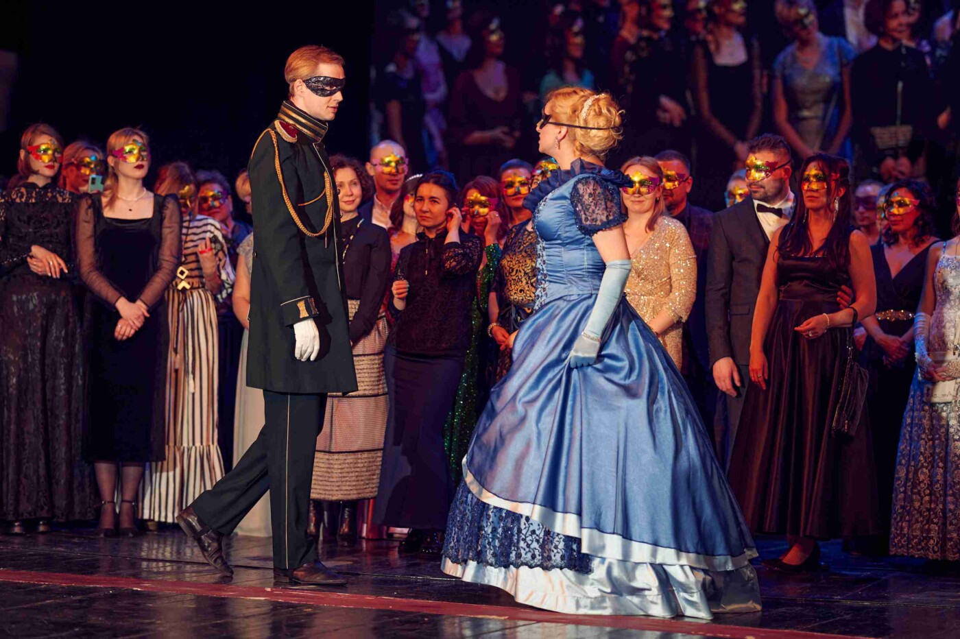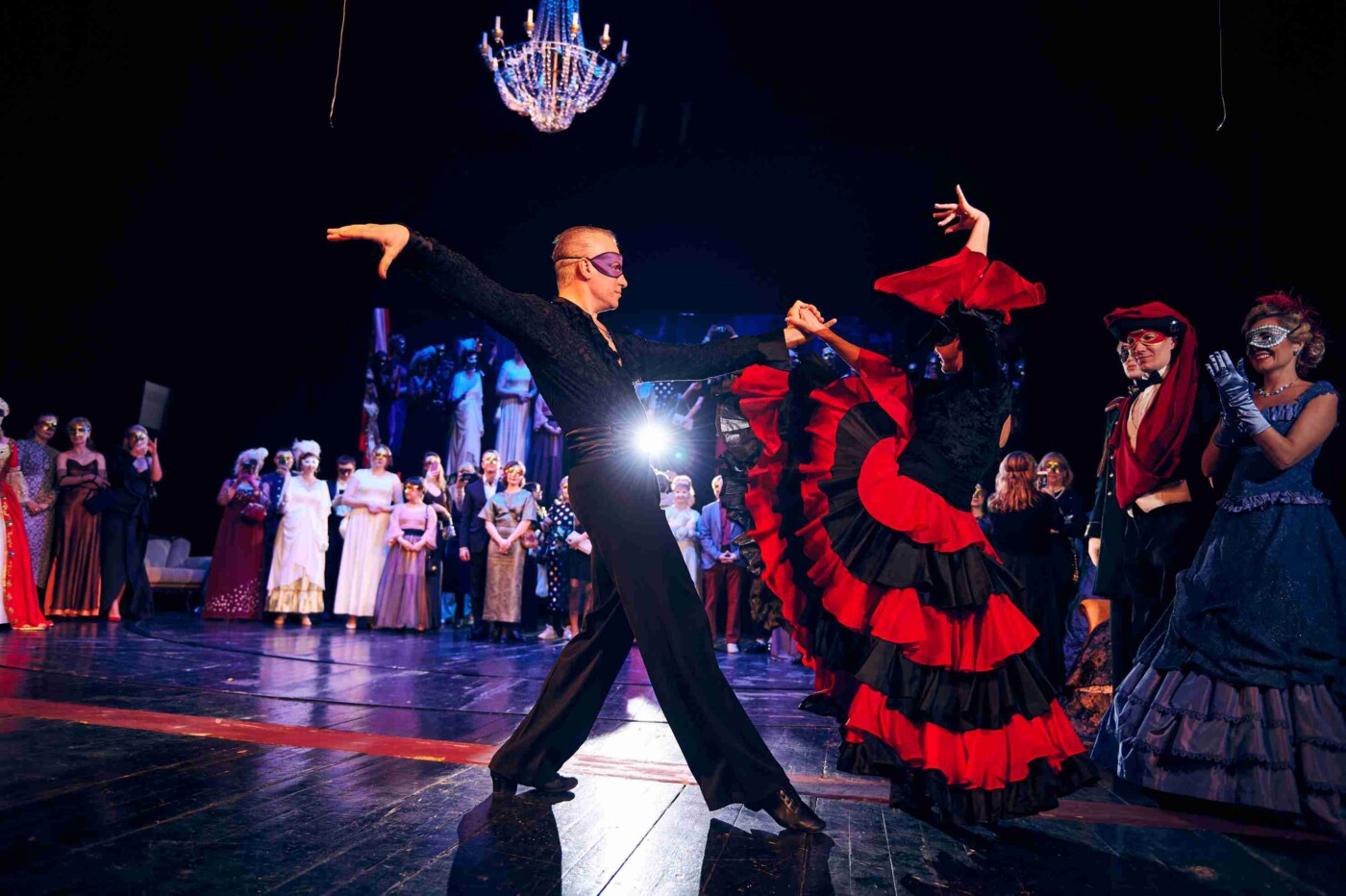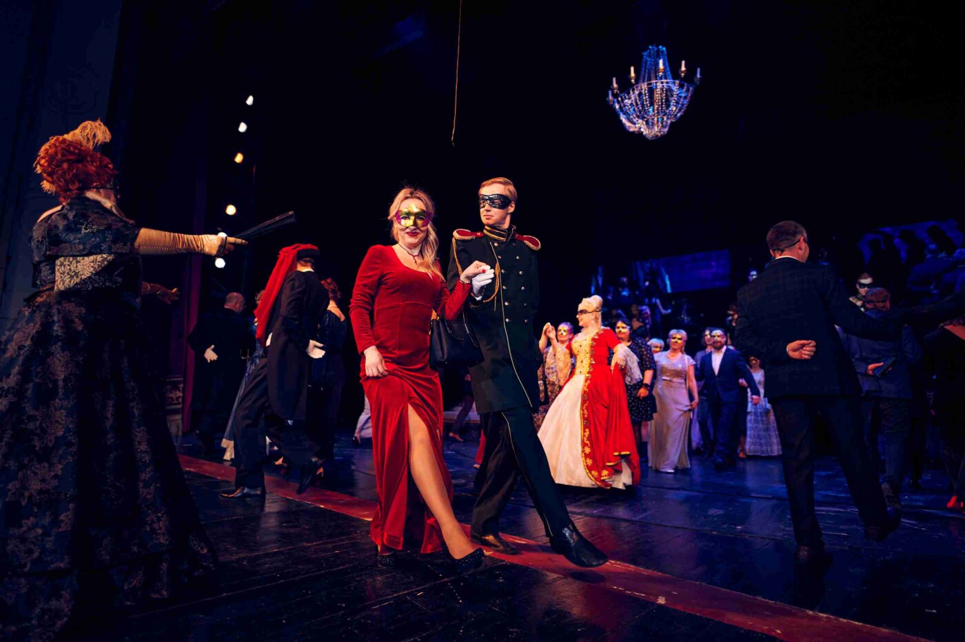 На маскараде гости театра смогли полюбоваться на экспрессивный испанский танец, стали свидетелями объяснения между князем Звездичем и баронессой Штраль, послушали романс в исполнении Нины и разучили полонез – этим танцем-шествием, как правило, начинались балы. Кроме того, зрительница, которая смогла назвать фамилии большинства артистов, занятых в сцене, лица которых тоже скрывали маски, получила сертификат на покупку в модном бутике.