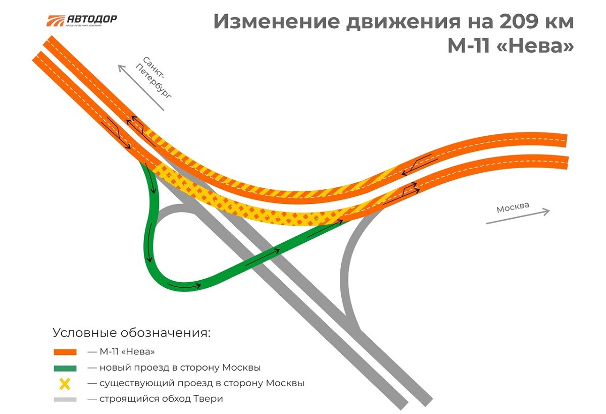С 8 сентября в Калининском районе Тверской области изменяется схема движения на скоростной федеральной трассе М-11 «Нева». Причиной станет проведение работ по строительству Северного обхода Твери.
