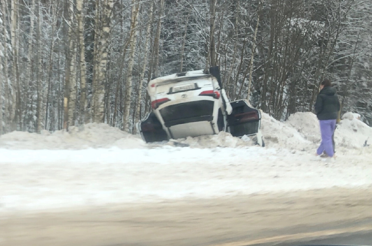 На фотографиях, опубликованных очевидцами в соцсетях, видно, что кроссовер вылетел в кювет и перевернулся на крышу. У седана в результате ДТП передняя часть оказалась полностью разбита.