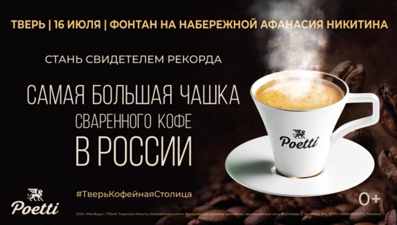 16 июля, в День города Твери, у фонтана на набережной Афанасия Никитина пройдет одно из самых масштабных мероприятий этого года – установка официального рекорда России. Кофейный бренд Poetti предпримет попытку сварить самую большую чашку кофе в стране.