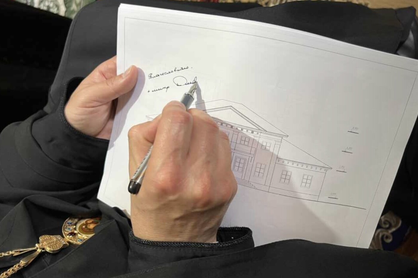 Эскиз будущего духовно-просветительского центра при Вознесенском храме митрополиту Амвросию представил настоятель Вознесенского храма Александр Сопига. Ознакомившись с ним, владыка благословил строительство.