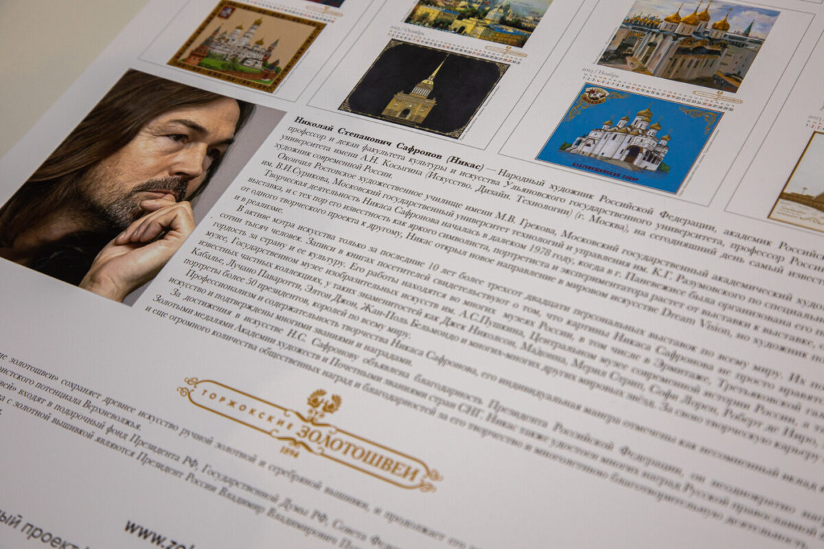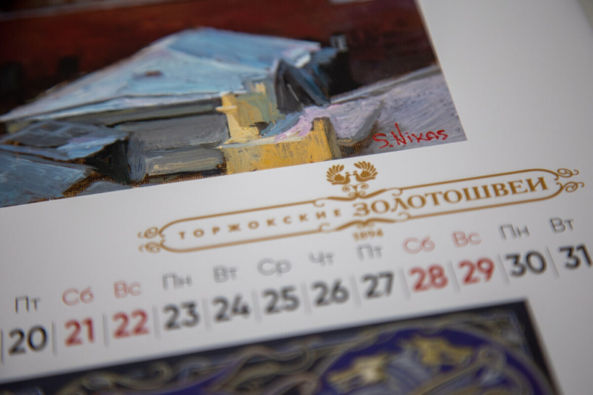 В 2022 году у предприятия «Торжокские золотошвеи» появлялись различные масштабные проекты – выставки, патриотические мероприятия, турпроекты. Одним из главных проектов можно уверенно назвать альбом-календарь, созданный совместно с самым известным в России художником Никасом Сафроновым. Живописец уже давно был знаком с художественным промыслом, процветающим в Торжокском крае, а «Торжокские золотошвеи» сохраняют искусство и сотрудничают с выдающимися мастерами своего дела. Так и родилось новое начинание.