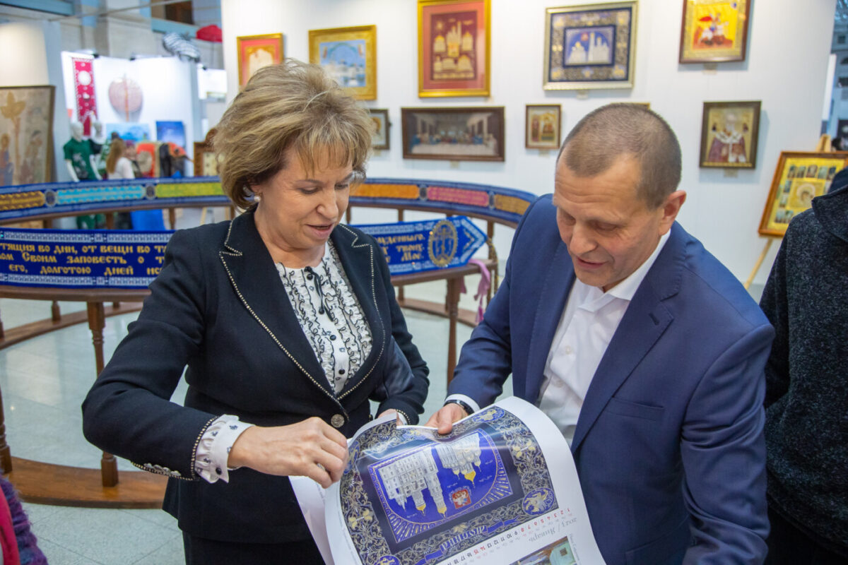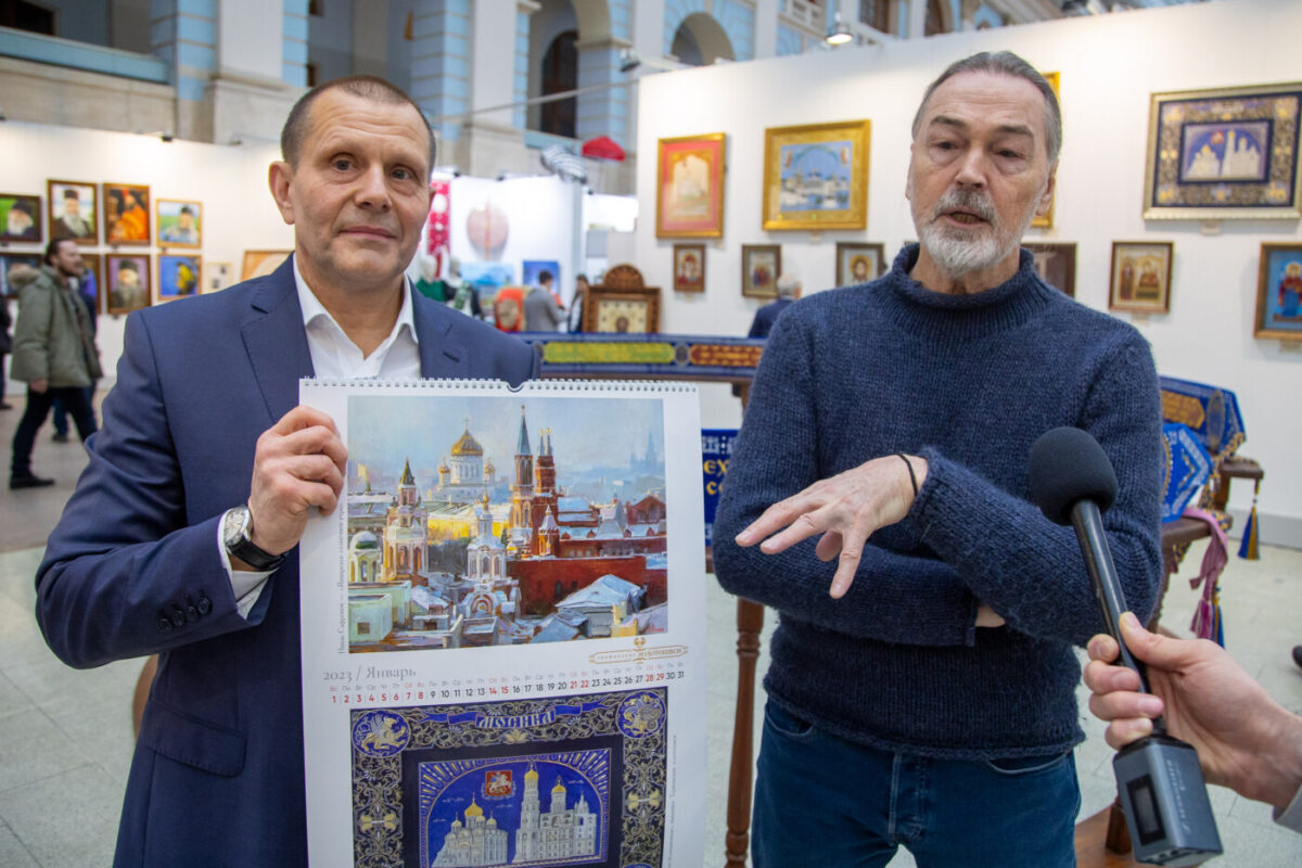 Специально для нового широкоформатного календаря живописец изобразил различные знаковые места России. Это в том числе Кремль, Исаакиевский собор, собор Василия Блаженного, Воскресенский Смольный собор и другие. Торжокские мастерицы изобразили эти объекты архитектурного наследия на панно. Таким образом в календаре отражены две точки зрения, объединенные темой православия.