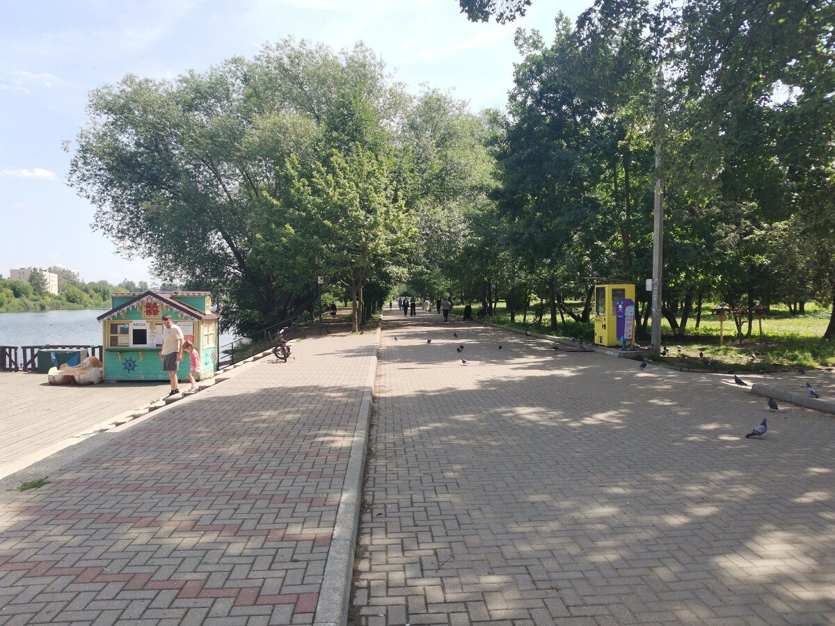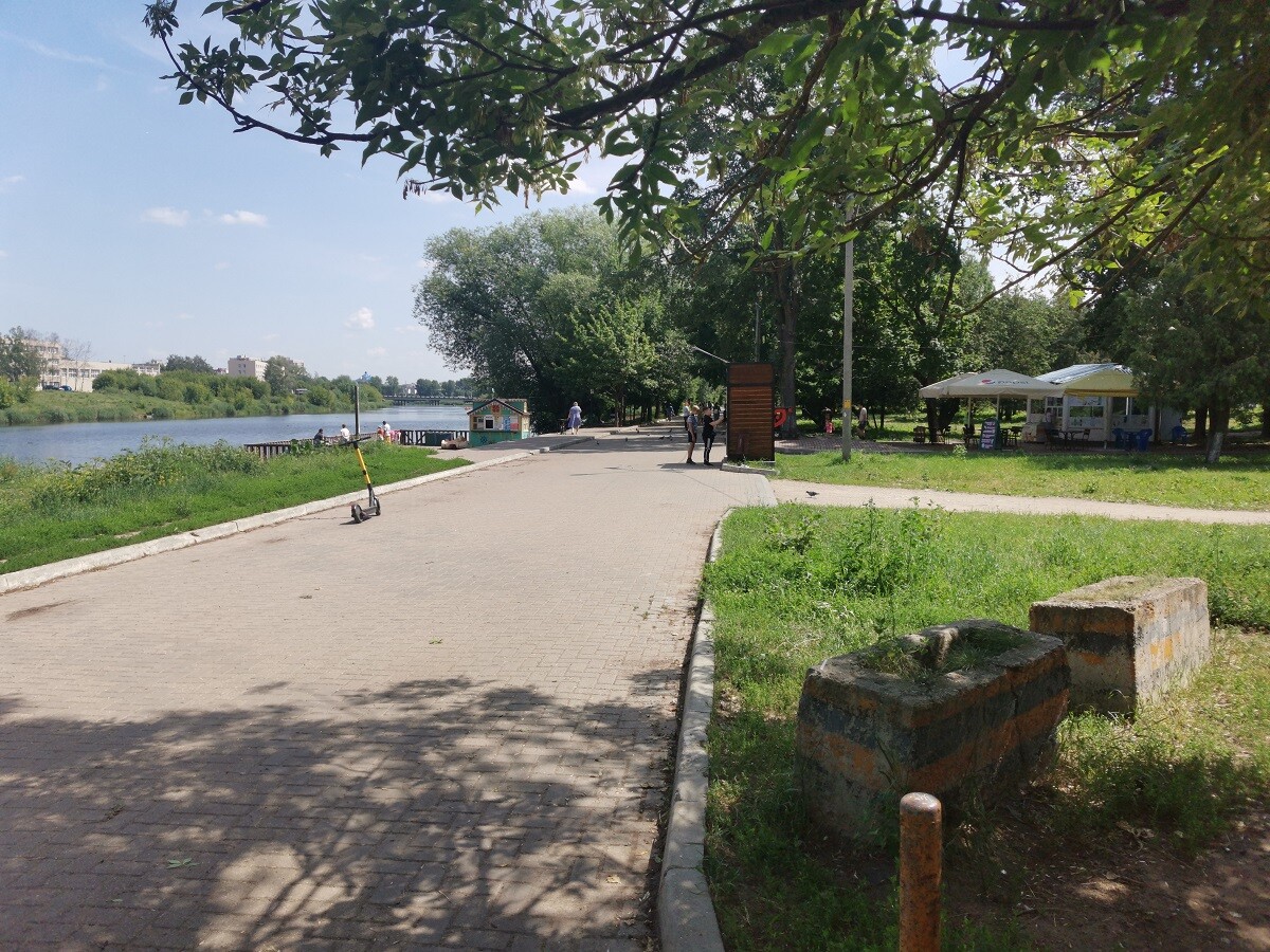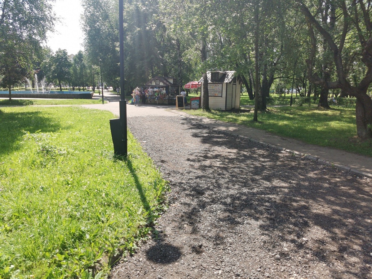 В погожие летние деньки парк выглядит достаточно опрятно. Здесь вовремя косят траву и обрезают деревья, активно работает несколько зон детских аттракционов и лодочный причал у берега многострадальной реки Лазури.