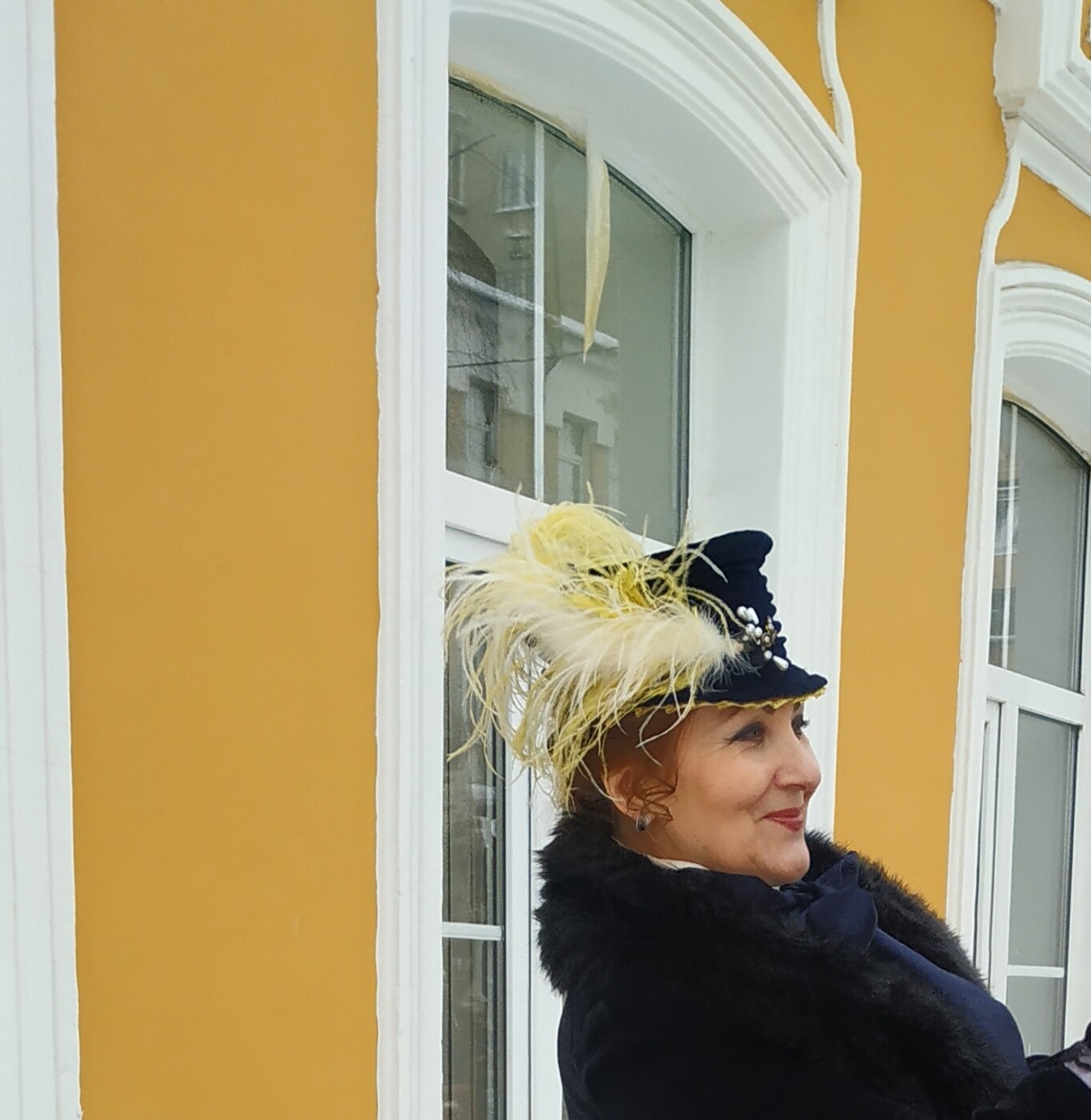 Как украшение в оригинале использованы легкие страусовые перья белого цвета, но не совсем так, напряглась, при более детальном изучении и приближении нескольких изображений картины, оказалось, что перья сдвоенные! Такой приём часто использовали в изготовлении шляпок. Так и сделала, фоновый жёлтый цвет, разбавленный белым, придает легкость, воздушность и эффектно смотрится на иссиня-черном бархате конрастируя с ним. Модистки знали толк! В декоре использована золоченая брошь, возможно, и золотая, (я использовала антик) и жемчуг, причем не только круглый, но и каплевидный, в моих «закромах» такого не оказалось, пришлось поискать, нашла. Удачный акцент! Перья прикрепила справа, в источнике они подвиты, я тоже это выполнила, но, что то пошло не так, гуляя по улице кудрявость на перьях исчезла. Хотя в целом, если делать вещь по первоисточнику, пусть и с погрешностями, все же это близко к исторической эпохе, похоже! И еще, я, отнюдь, не претендую на сходство с дамой Крамского.