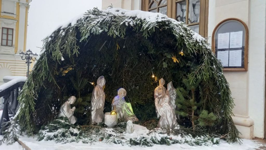 Прямо у входа в Спасо-Преображенский кафедральный собор вырос чудесный рождественский вертеп. Он собран из пушистых еловых веток, украшен гирляндами, а внутри, среди сосновых лап, замерла трогательная сцена: фигурки Младенца Христа, Богородицы, Иосифа и волхвов.