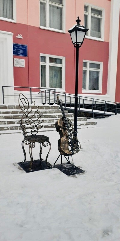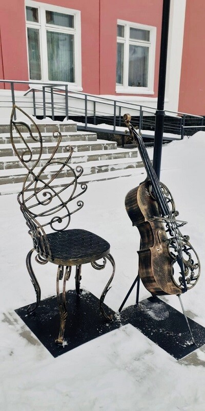 В городе Ржев Тверской области появился интересный арт-объект. На улице Ленина установили бронзовую виолончель, а рядом с ней расположили бронзовый стул со спинкой – нотным станом и скрипичным ключом. Завершает композицию старинный уличный фонарь.
