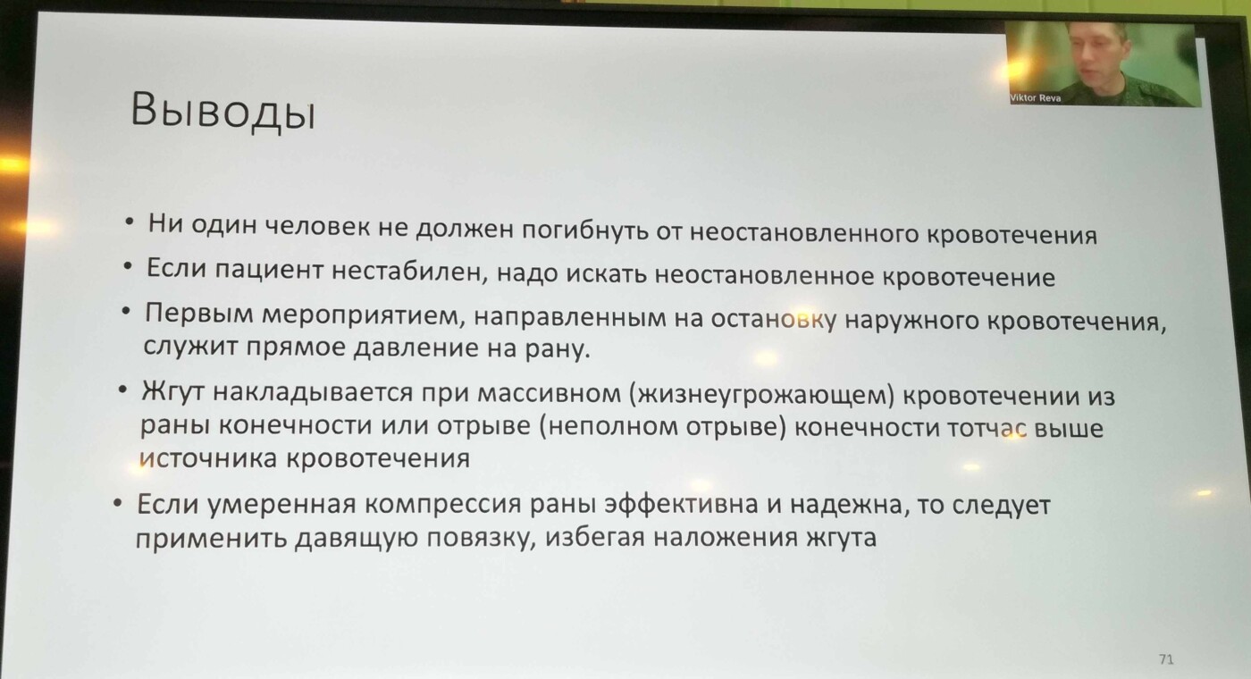 Показательно, чем лучше бойцы знают правила оказания первой медицинской помощи, тем выше шанс сохранить здоровье и жизнь в случае возникновения ранения у себя или боевого товарища. «К сожалению, многие люди, оказывая первую медицинскую помощь, руководствуются личным опытом, знаниями, почерпнутыми из телеграм-каналов, устаревших учебников и неполных переводов англоязычных ресурсов, – подчеркнул В.А. Рева. – В этой информации очень много противоречий. Недавно создано Российское сообщество первой помощи. В его рамках мы проанализировали и внедряем эффективные алгоритмы остановки кровотечений, в том числе в рамках оказания первой помощи и скорой медицинской помощи».