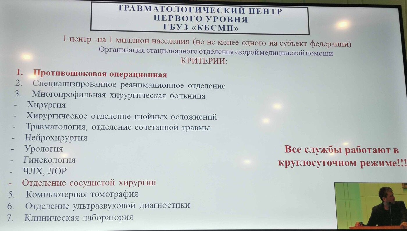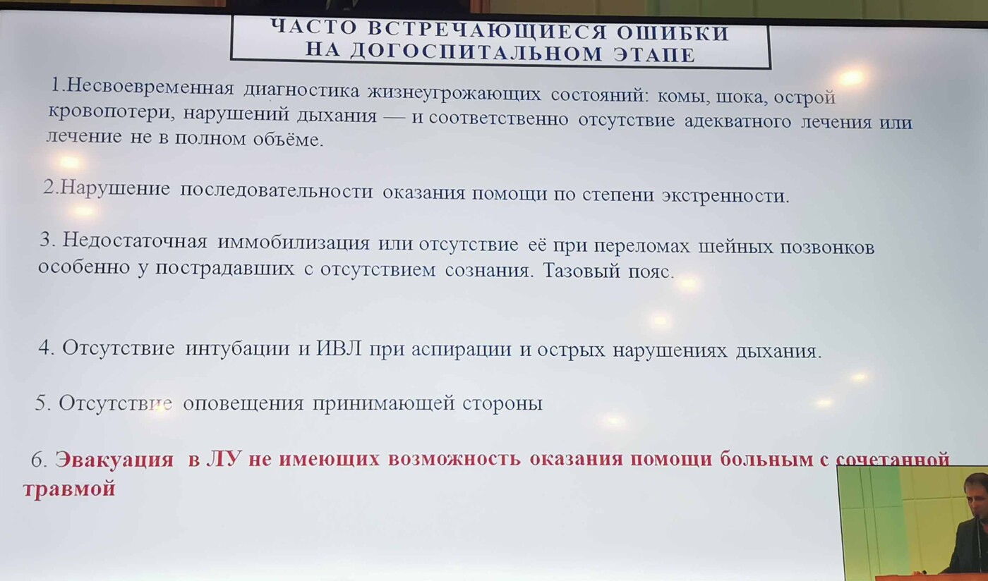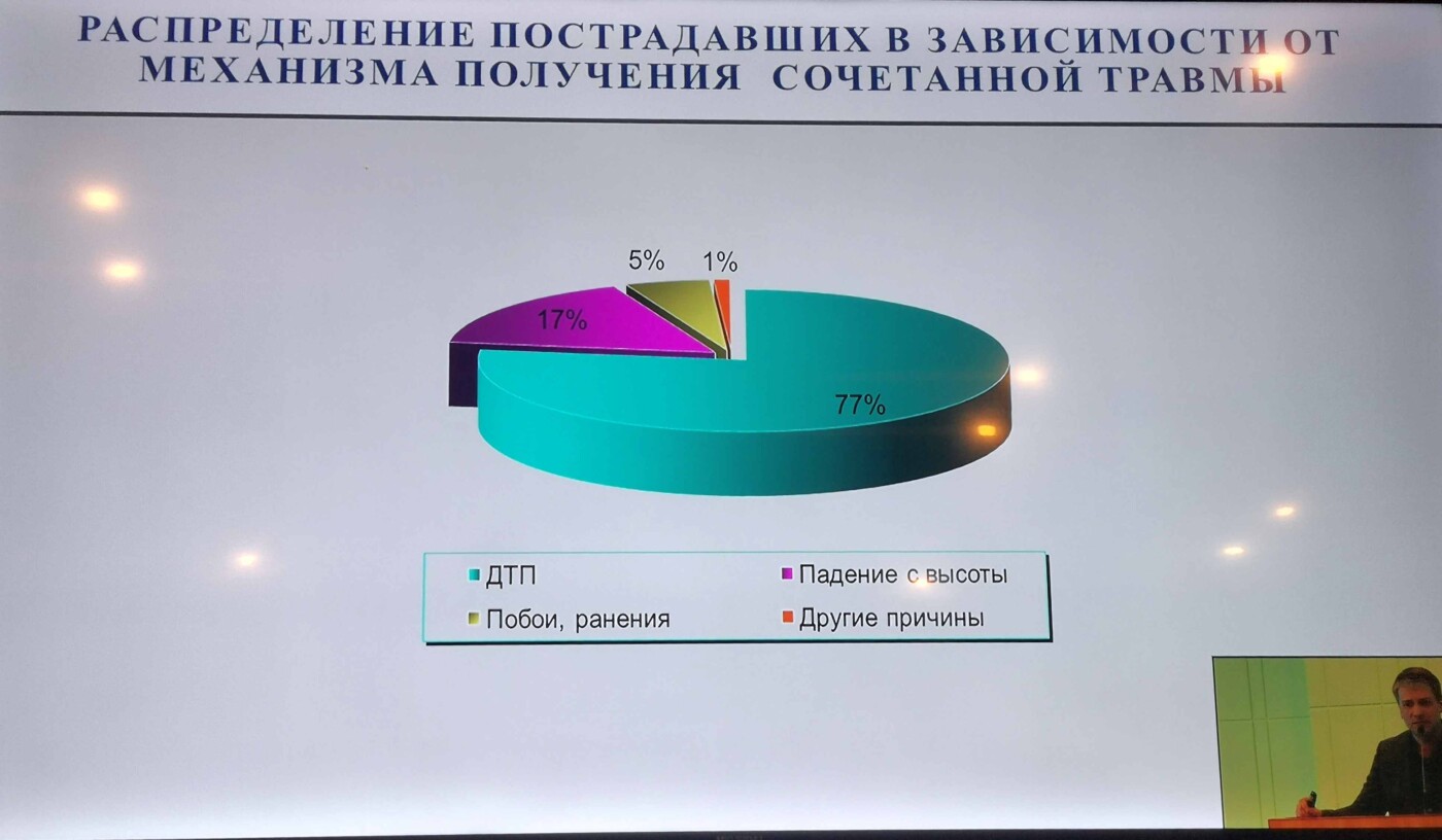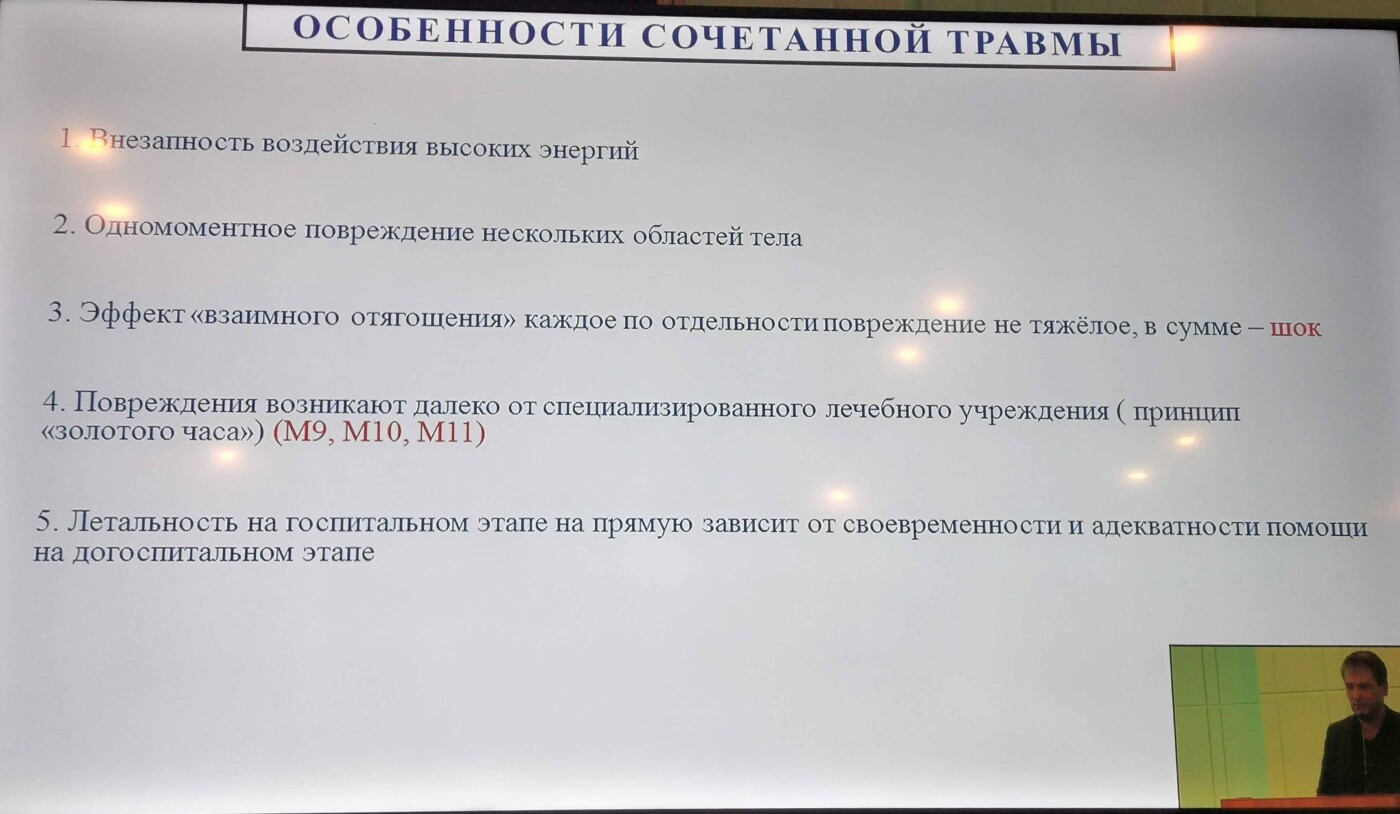 Среди докладов важно отметить выступление заместителя главного врача по хирургии Клинической больницы скорой медицинской помощи Тверской области кандидата медицинских наук Юрия Валерьевича Павлова. Он рассказал о принципах оказания помощи и госпитализации при сочетанной травме – одновременном повреждении нескольких областей тела человека.