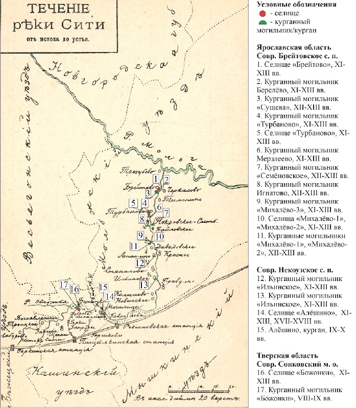 Известный археолог К.И. Комаров проводил систематические раскопки и разведки в Тверской, Ярославской и Костромской областях. Он убедительно доказал, что отмеченный в летописях путь Юрия Всеволодовича на Ярославль и Волгу шел через устье Шексны к Мологе и далее к низовьям Сити. И это заключение совпадает со сведениями о месте сражения в разных редакциях Жития Юрия Всеволодовича, которые, несмотря на поздний характер, устойчиво локализуют битву в низовьях реки: «на реце на Сите за Мологою рекою в Углецком уезде» или «близ реки Волги на реце Сити».