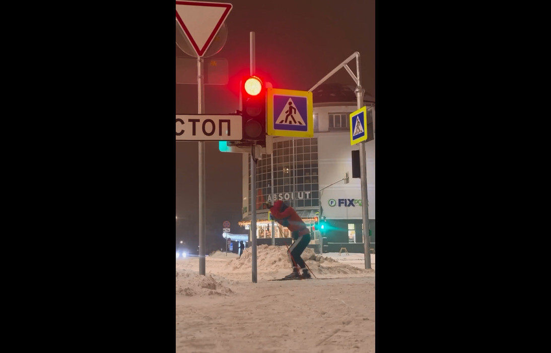На видео, размещенном в телеграм-канале «Осторожно. Тверь», видно, как юноша в ярком красном лыжном костюме с удовольствием едет на лыжах по Тверскому проспекту, по улице Желябова мимо главного здания ТвГУ и по другим улицам центра города.