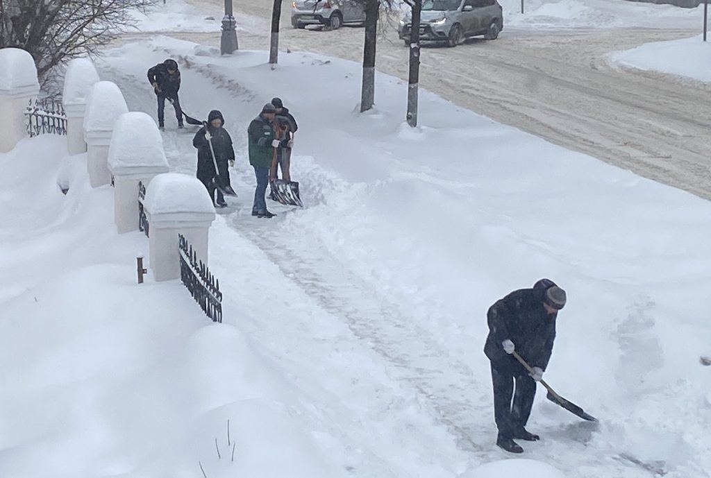 Пешеходы с трудом пробираются по тропинкам, протоптанным на пешеходной Трехсвятской – идут след в след. Только у магазинов снег убран силами продавцов.
