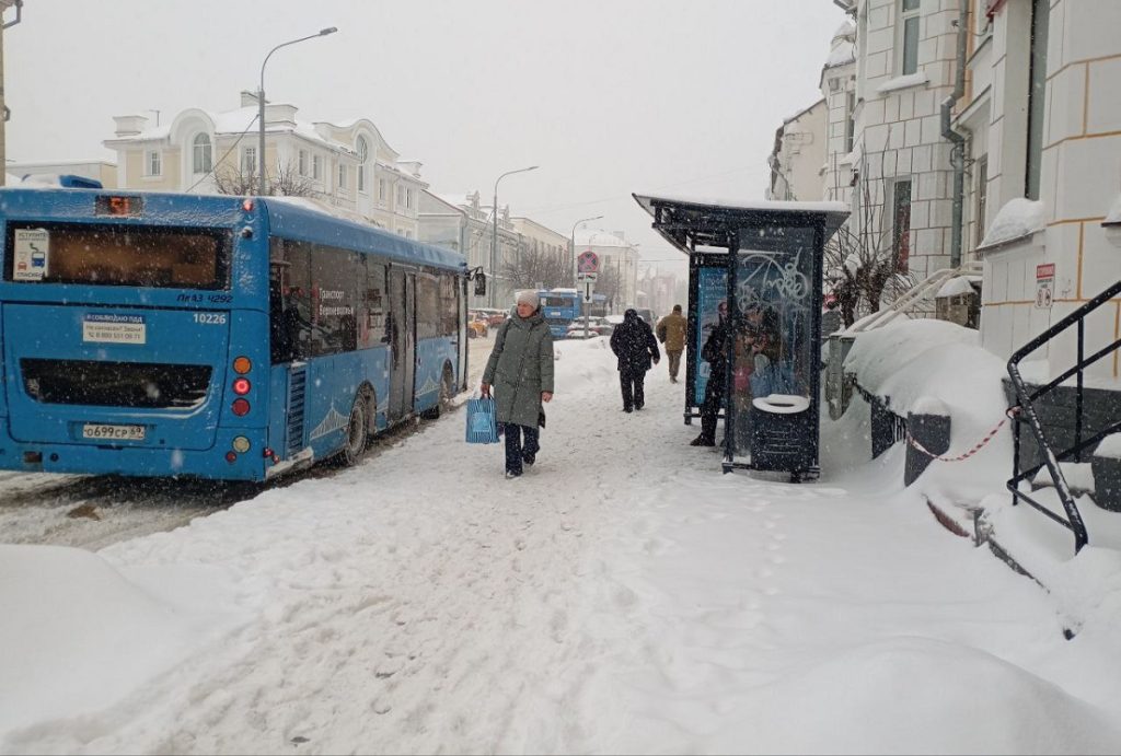 Пассажирам автобусов еще хуже — остановки завалены снегом. Приложение «Волга» сбоит из-за проблем с мобильным интернетом, видимо, вызванными ночным налетом на Тверскую область БПЛА.