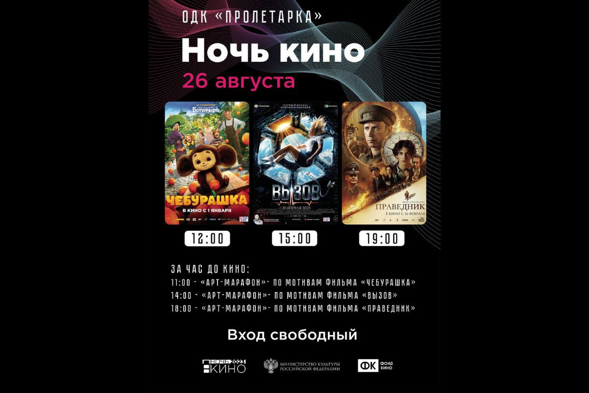 26 августа жителей и гостей Твери приглашают присоединиться ко Всероссийской акции «Ночь кино — 2023». В ОДК «Пролетарка» и в мультимедийном историческом парке «Россия — Моя история» пройдут бесплатные показы популярных российских фильмов последних годов