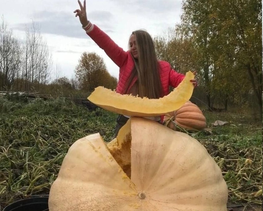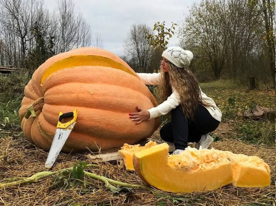 Тверитянка Наталья Волкова разрезала свои гигантские тыквы, которые участвовали в конкурсе «ТыквыБатл 2023 Online». Фото овощной экзекуции опубликовано в сообществе «Вышний Волочек» Вконтакте