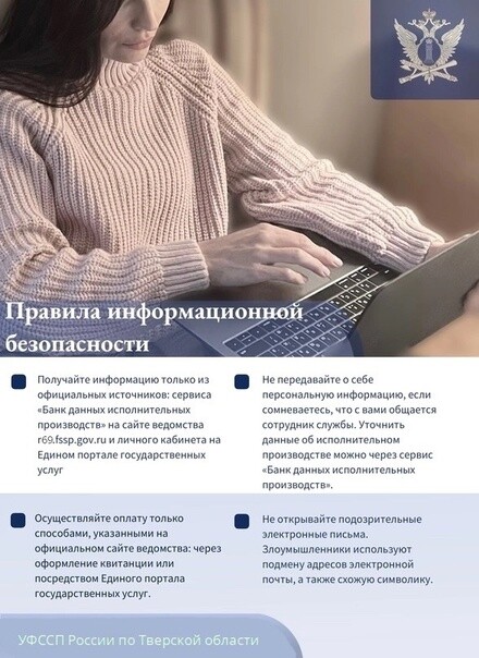 Управление Федеральной службы судебных приставов по Тверской области напоминает гражданам о возможности получения необходимой информации из официальных источников, о способах защиты своих персональных данных при посещении сети Интернет.