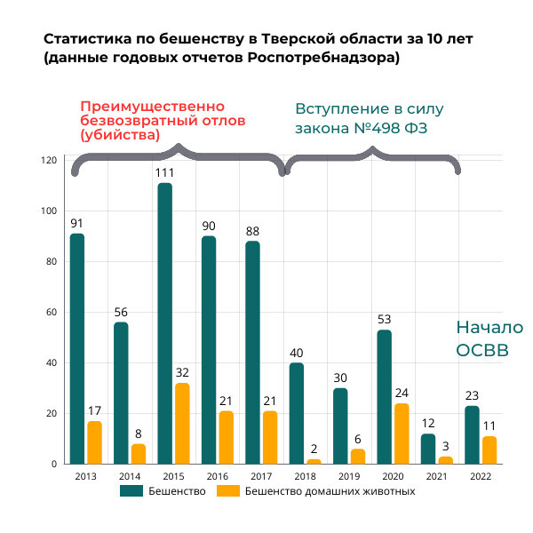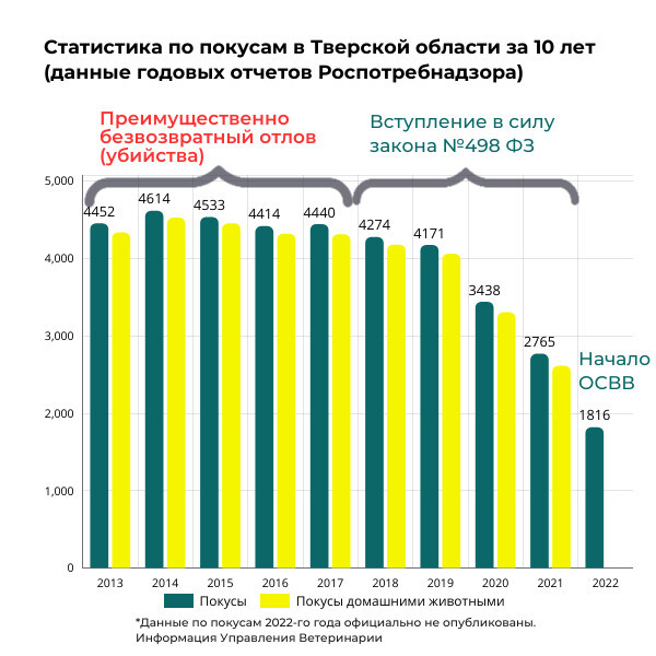 С 2018 года, когда был принят закон «Об ответственном обращении с животными» № 498-ФЗ и массовые убийства прекратились, количество покусов и бешенства тут же пошли на спад. В это время регулированием численности бездомных животных в Тверской области занимались преимущественно общественные организации – стерилизовали, пристраивали в добрые руки и проводили просветительскую работу с населением.