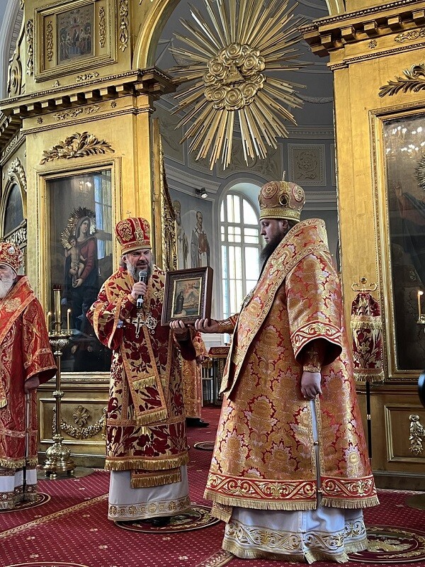 В завершение богослужения ректор СПбДА приветствовал митрополита Амвросия и вручил ему список чудотворной иконы Божией Матери Знамение «Царскосельская». Поблагодарив епископа Силуана за подарок, тверской владыка обратился к преподавателям и студентам академии.