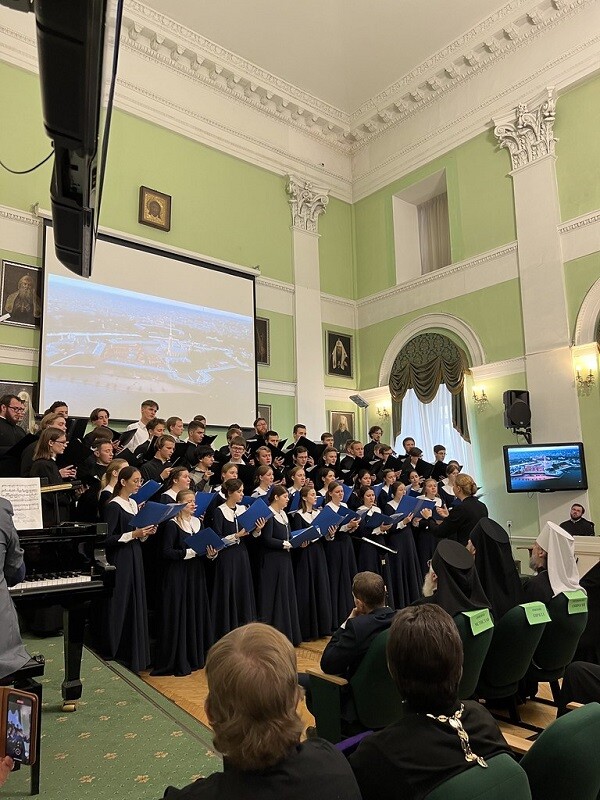 Торжественная часть завершилась выступлением мужского, женского и смешанного хоров Санкт-Петербургской духовной академии, которые исполнили духовные песнопения и светские композиции.
