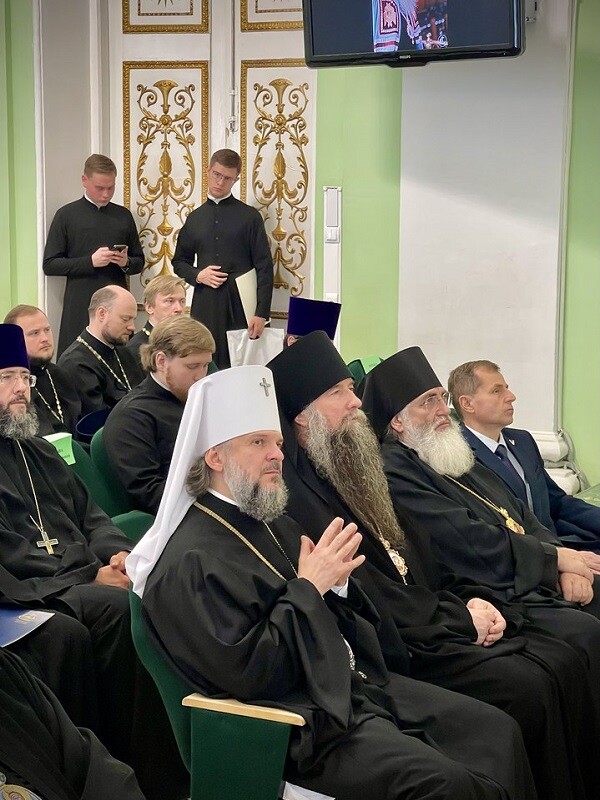 После богослужения духовенство и учащиеся перешли в Актовый зал, где состоялась торжественная часть празднования. Здесь епископ Силуан вручил митрополиту Амвросию, который был ректором духовного вуза с 2008 по 2018 год, диплом почетного члена Санкт-Петербургской духовной академии. Высокое звание тверскому архиерею присвоил Ученый совет СПбДА 21 декабря 2021 года.
