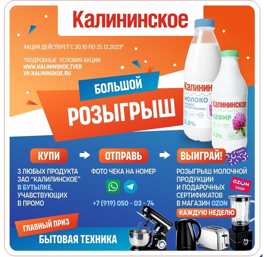 ЗАО «Калининское» объявляет акцию: купи три любых продукта ЗАО «Калининское» в бутылке (кефир, молоко), отправь фото чека в любой из мессенджеров по номеру 8-919-050-03-74 и получай подарки каждую неделю, а также участвуй в большом розыгрыше бытовой техники по окончании акции.