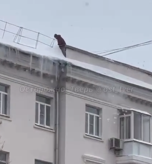 В телеграмм-канале «Осторожно: Тверь» очевидцы поделились видео, на котором рабочие чистят крышу от снега.