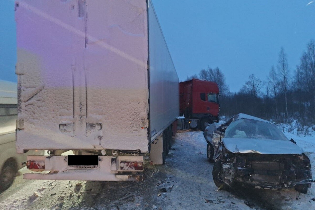 ДТП на автомагистрали М-9 «Балтия» в Зубцовском округе произошло около 16 часов. Как сообщили в управлении ГИБДД УМВД России по Тверской области, водитель Hyundai в условиях снегопада протаранил металлическое ограждение дороги. После этого легковушку отбросило на фуру Scania.